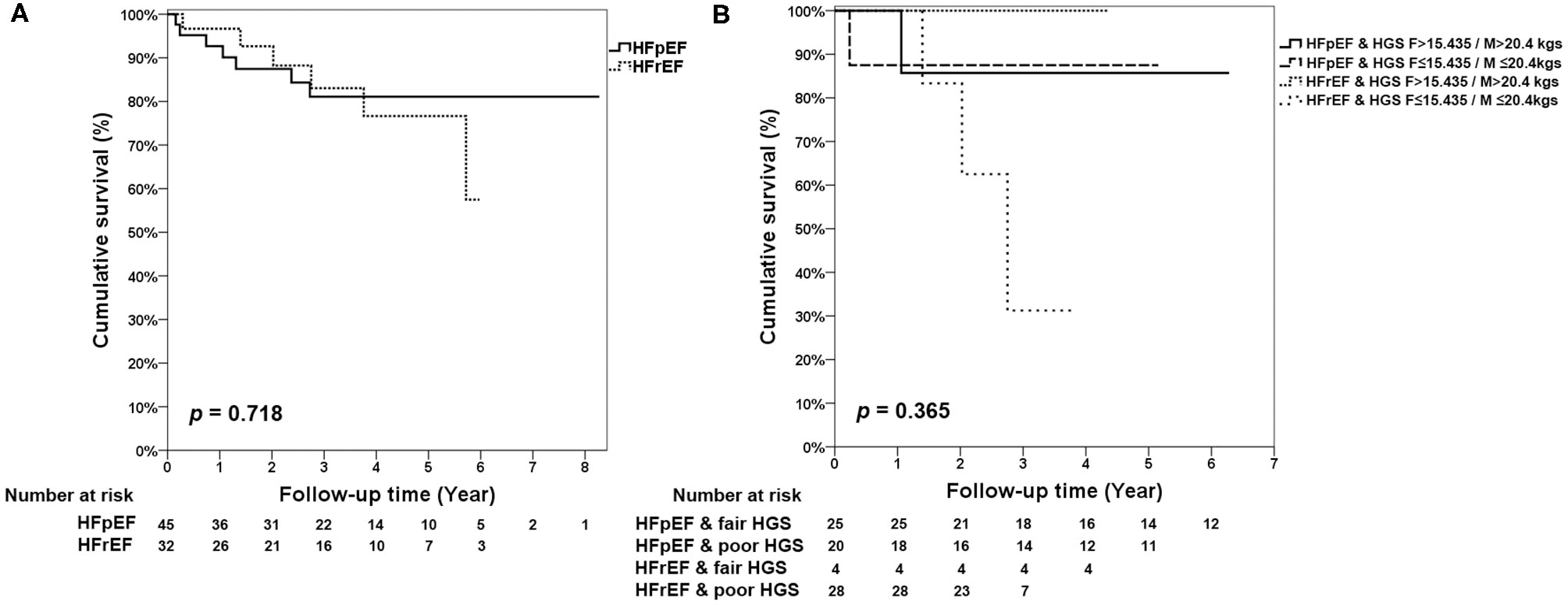 Results: Among 331 old patients with CKD, their mean age was 81.3 ± 6.6 years. CKD stages showed the following distributions: stage 3, 74.9%; stage 4, 15.7%; stage 5, 9.4%. The prevalence of HF was 23.3%, and Rockwood frailty was 74.3%. Rockwood frailty and HF were both significantly associated with CKD stages. After a mean follow-up period of 3.1 ± 2.1 years, 44 patients died, and a crude analysis showed that stage 4, stage 5 CKD, low HGS, and Rockwood frailty index were associated with mortality. Regarding the survival of these patients, the adjusted mortality hazard ratio for CKD stage 5 was 3.84 against stage 3A [95% confidence interval (CI) 1.51–9.75], 1.04 (95% CI 1.01–1.07) for higher Rockwood frailty score, 4.78 (95% CI 1.26–18.11) for HFrEF, and 3.47 (95% CI 1.15–10.42) for low HGS. Survival analysis using Kaplan–Meier survival plots showed that patients with both HF and poor HGS had the poorest survival.