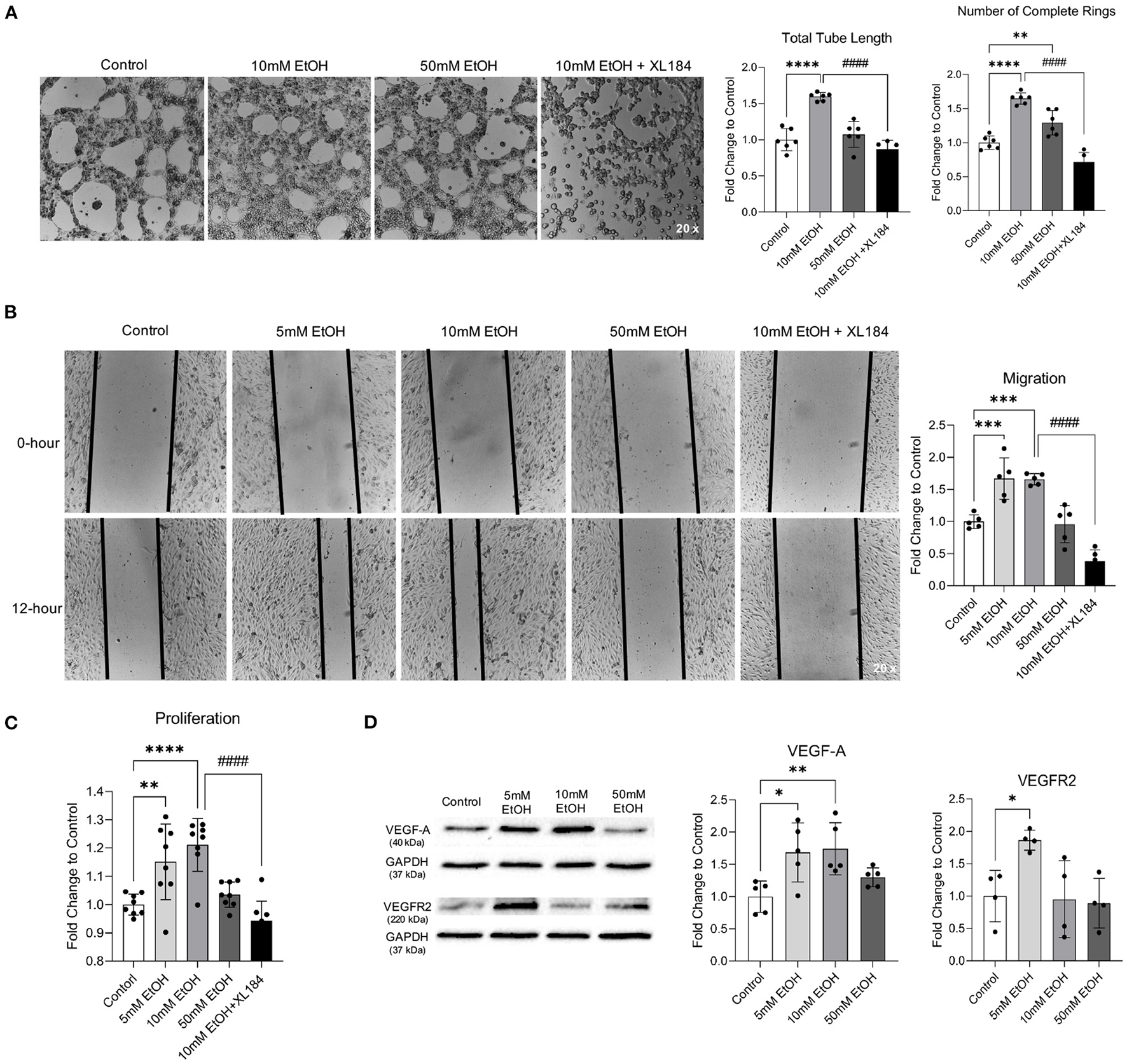 Acute exposure to low concentration (5 and 10 mM) ethanol significantly increased the total tube length and number of complete rings in Matrigel Assay, migration in Scratch Wound Healing Assay, and proliferation in Proliferation Assay (Figures 1A–C). In addition, 5 mM ethanol significantly upregulated both VEGF-A and VEGFR2 and 10 mM ethanol significantly upregulated VEGF-A (Figure 1D). Furthermore, VEGFR2 inhibitor, XL184, abolished 10 mM ethanol-induced tube formation, migration, and proliferation (Figures 1A–C). In contrast, acute exposure to 50 mM ethanol did not alter the migration, proliferation, and expression of VEGF-A and VEGFR2 (Figures 1B–D). But it significantly increased the number of complete rings in Matrigel Assay (Figure 1A).
