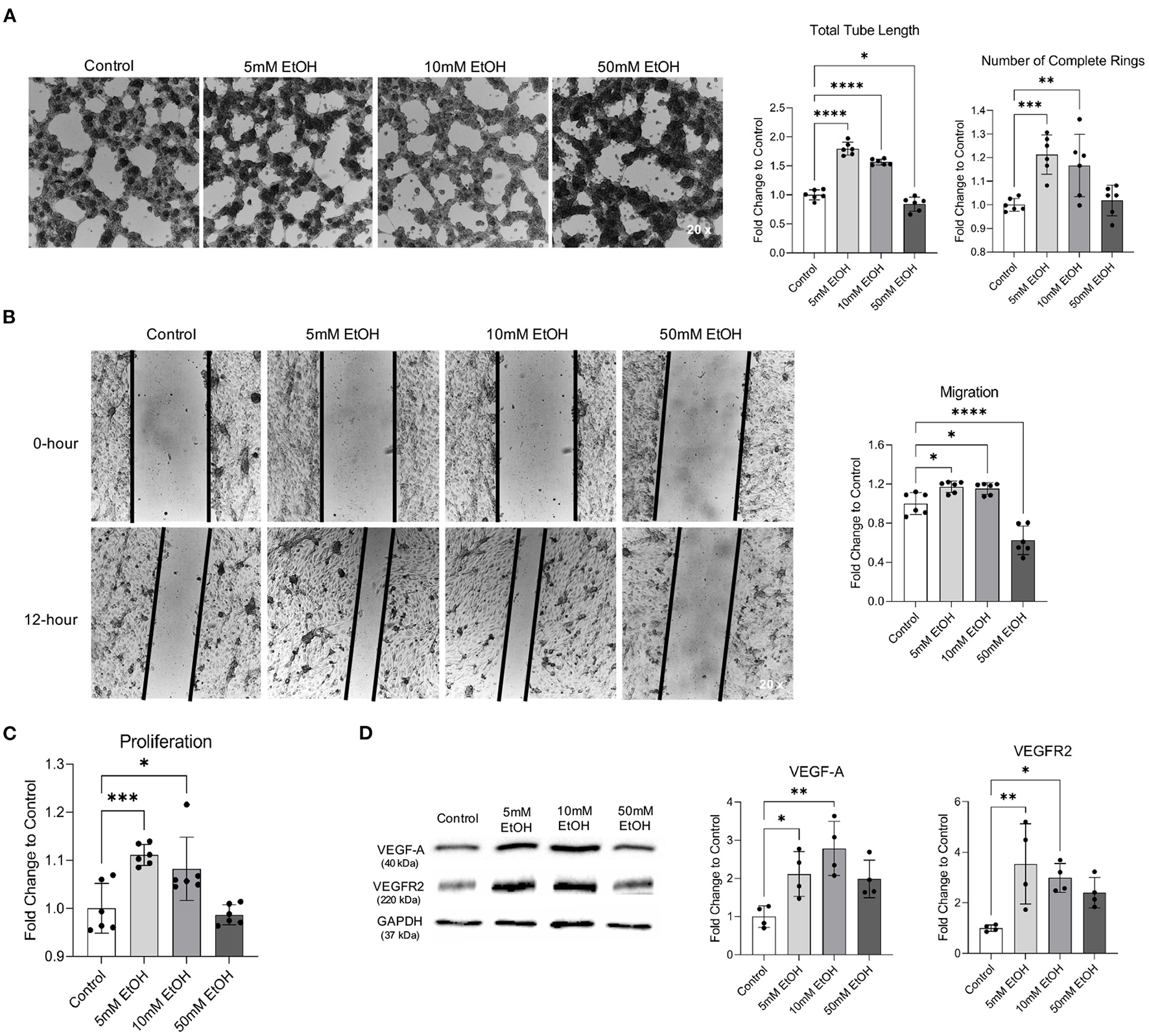 Two-hour exposure to 5 and 10 mM ethanol once a day for 7 days significantly increased the total tube length and number of complete rings in Matrigel Assay, migration in Scratch Wound Healing Assay, and proliferation in Proliferation Assay (Figures 2A–C). In addition, 7-day exposure to 5 and 10 mM ethanol significantly upregulated both VEGF-A and VEGFR2 (Figure 2D). In contrast, although 4-h exposure to 50 mM ethanol once a day for 7 days did not alter the number of complete rings in Matrigel Assay, proliferation in Proliferation Assay, and expression of VEFG-A and VEGFR2 (Figures 2A,C,D), it significantly reduced the total tube length in Matrigel Assay and the migration in Scratch Wound Healing Assay (Figures 2A,B).