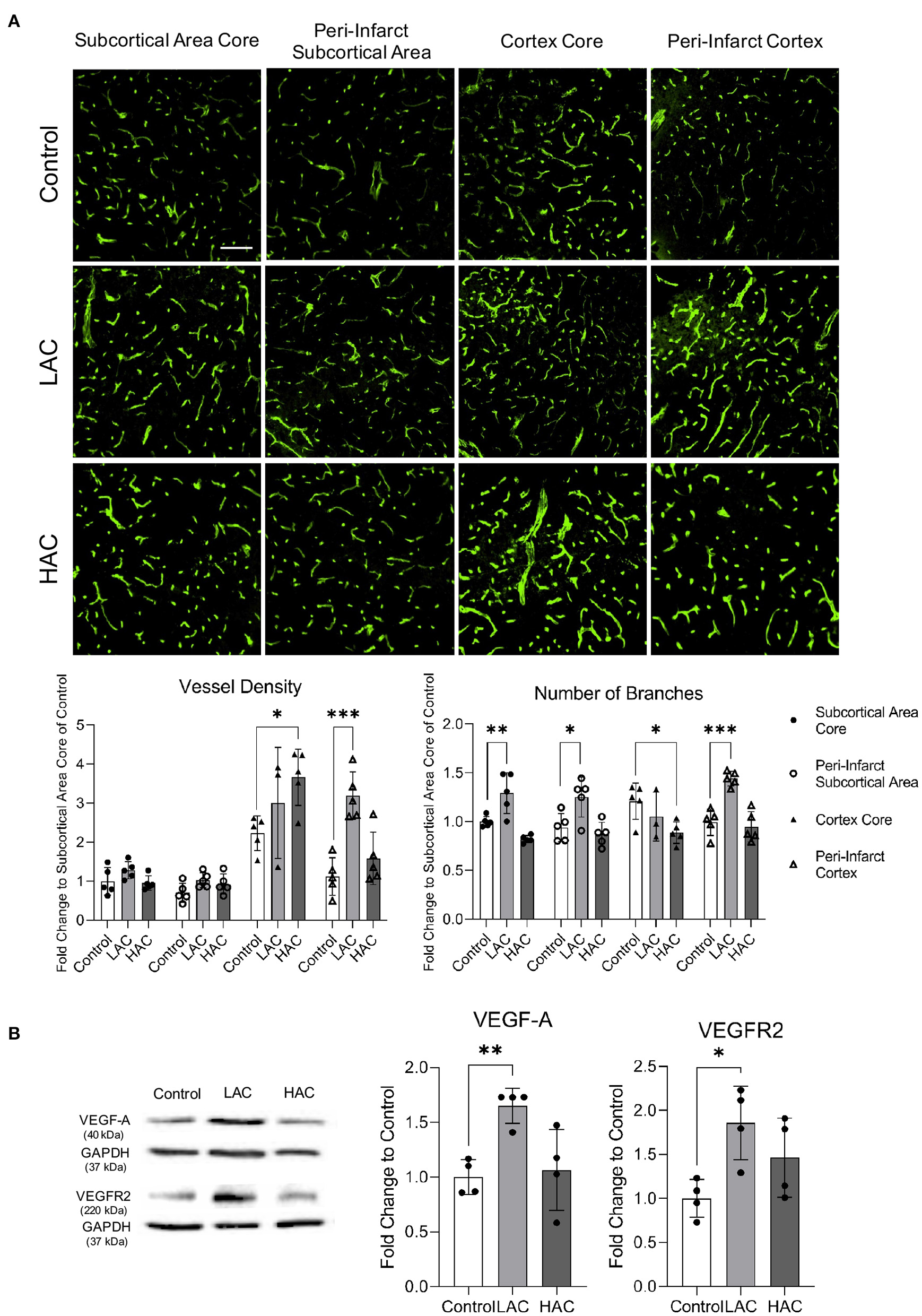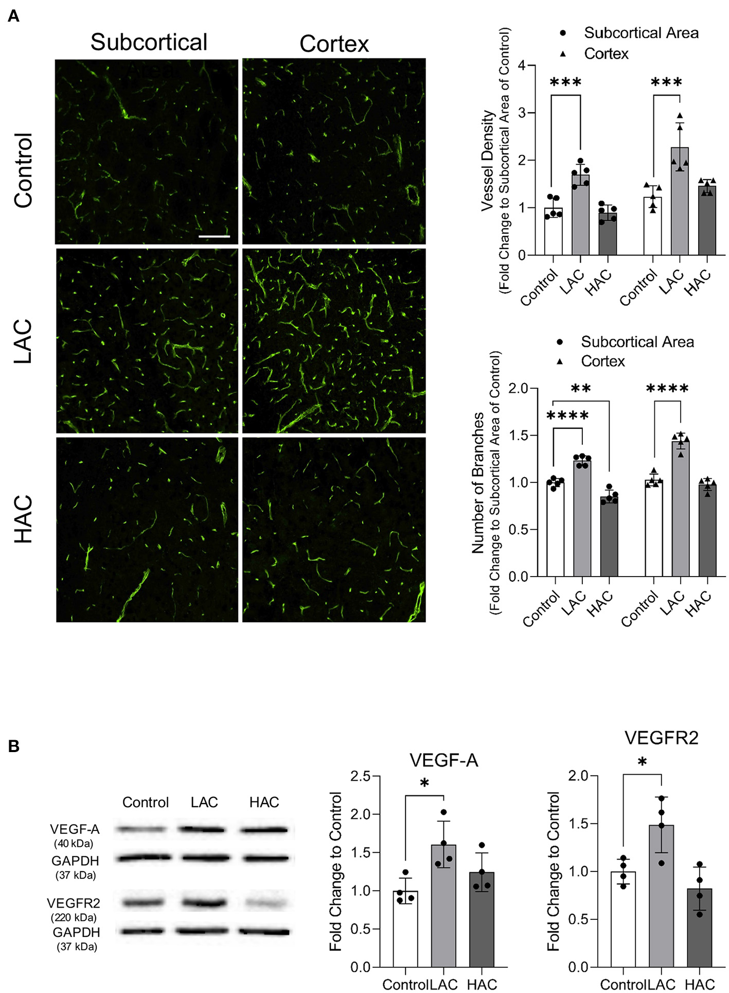 In the present study, the influence of LAC and HAC on cerebral angiogenesis under physiological conditions and following transient focal cerebral ischemia was investigated. There are several new findings. First, both acute and chronic exposure to low-concentration alcohol increased angiogenic capability and upregulated VEGF-A and VEGFR2 in MBMVECs. Second, VEGFR2 inhibitor abolished acute low-concentration alcohol exposure-induced angiogenic capability. Third, LAC increased vessel density and number of branches in the cerebral cortex and subcortical area under physiological conditions and the peri-infarct cortex following transient focal cerebral ischemia. Fourth, LAC upregulated VEGF-A and VEGFR2 in the cerebral cortex under physiological conditions as well as following ischemic stroke. Fifth, LAC increased vasodilation and rCBF during reperfusion but not ischemia. Sixth, HAC had a minor inhibitory effect on cerebral angiogenesis and did not alter either VEGF-A or VEGFR2. We speculate that upregulation of VEGF-A and VEGFR2 may be involved in LAC-induced cerebral angiogenesis. In addition, the protective effect of LAC against cerebral I/R injury does not appear to be related to an alteration in cerebral vasoreactivity/rCBF during ischemia.