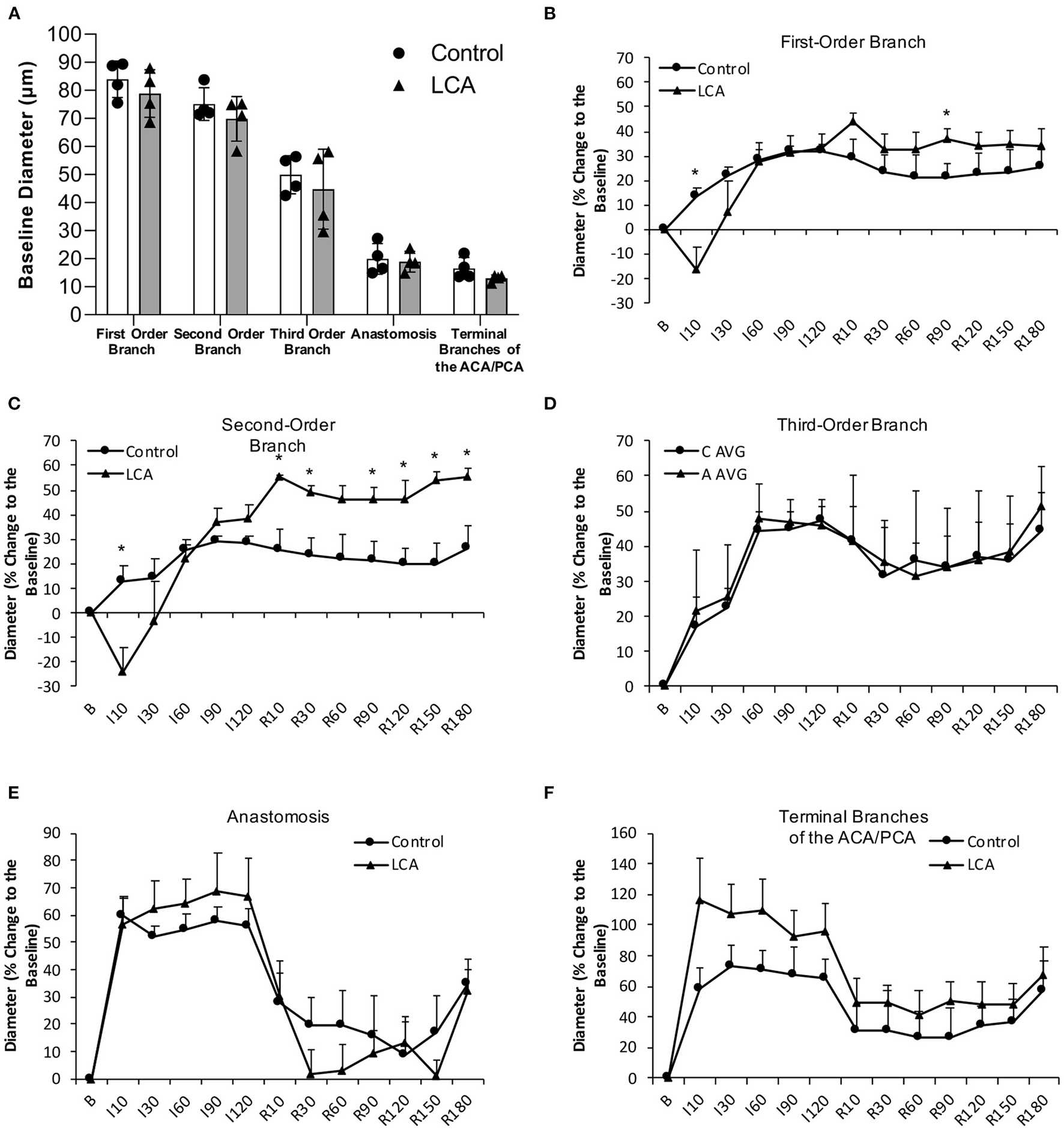 Effect of LAC on baseline diameter and vasoreactivity of the MCA, arterial anastomoses, and terminal branches of the ACA/PCA during 2-h MCA ligation and 3-h reperfusion. (A) Baseline diameter. Values are mean ± SD for four mice in each group. Analyzed using one-way ANOVA. (B–D) Vasoreactivity of the MCA. (E) Vasoreactivity of the arterial anastomoses. (F) Vasoreactivity of the terminal branches of the ACA/PCA. *P < 0.05 vs. Control. Analyzed using unpaired t-test.