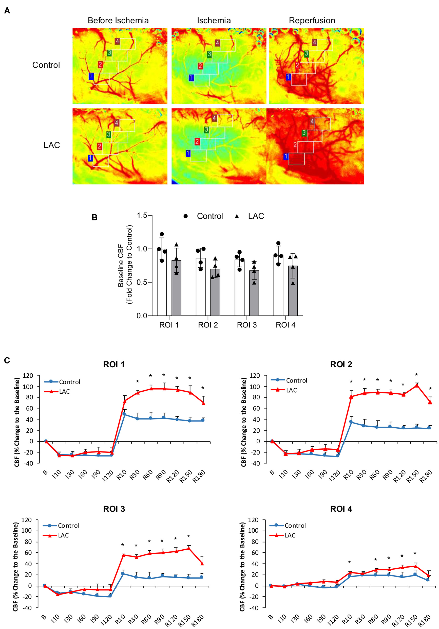 Effect of LAC on rCBF during 2-h MCA ligation and 3-h reperfusion. (A) Representative laser speckle images of rCBF. (B) Baseline rCBF. Values are mean ± SD for four mice in each group. Analyzed using one-way ANOVA. (C) Percentage changes of rCBF to the baseline during ischemia and reperfusion. *P < 0.05 vs. Control. Analyzed using unpaired t-test.