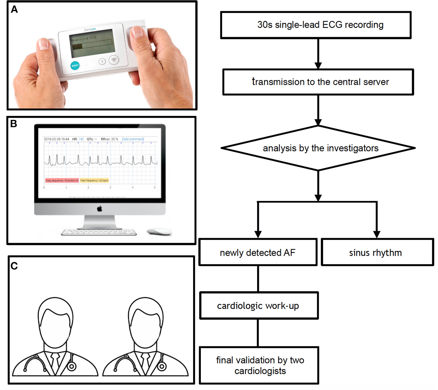 Single-lead ECG recording and interpretation with the Zenicor device. (A) Thirty second single-lead ECG handheld device recording, (B) analysis of the ECG on the central server, and (C) final validation by two cardiologists in case of newly detected AF. AF, atrial fibrillation; ECG, electrocardiogram.