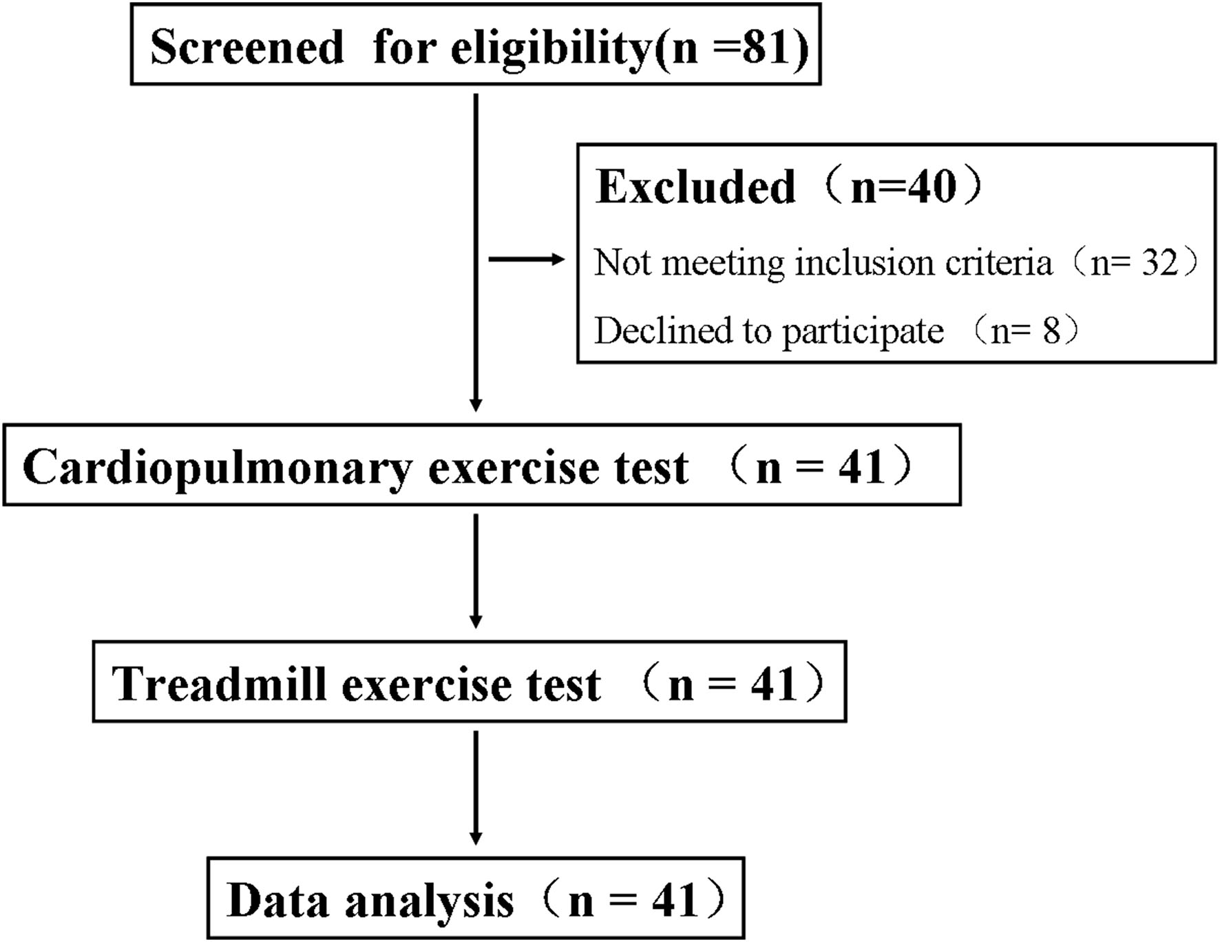 A total of 41 subjects were enrolled in the study (Figure 1), patient characteristics are displayed in Table 1. All patients had undergone PCI revascularization before, of which 25 (61.0%) were due to acute myocardial infarction and 16 (39.0%) were due to unstable angina pectoris. The median number of stents implanted was 2 (1–4), and the median time between CPET and the last PCI was 6 (2.25–12 weeks). None of the patients had any discomfort such as chest pain 2 weeks before the test. in addition, biochemical and cardiac ultrasound indicators indicated that the disease was in a stable state.