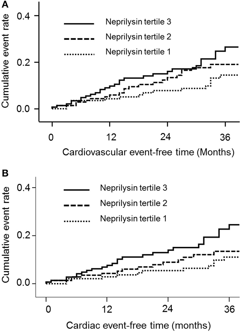 Results: Plasma neprilysin level was positively correlated with left ventricular (LV) mass index, LV end-systolic volume, and LV end-diastolic volume. Multivariate linear regression analysis revealed that neprilysin level was negatively correlated with LV ejection fraction (β = −2.14; p = 0.013). The cumulative event rate of the composite of CV events was significantly greater in neprilysin tertile 3 (p = 0.049). Neprilysin tertile 3 was also associated with an increased cumulative event rate of cardiac events (p = 0.016). In Cox regression analysis, neprilysin tertile 3 was associated with a 2.61-fold risk for the composite of CV events [95% confidence interval (CI), 1.37–4.97] and a 2.72-fold risk for cardiac events (95% CI, 1.33–5.56) after adjustment for multiple variables.