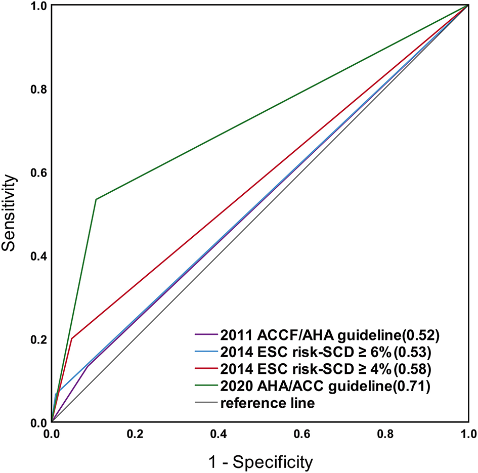 Results: During a follow-up of 4.7 ± 1.7 years, 15 patients (2.9%) reached the SCD endpoint and 12 (2.3%) were protected by implantable cardioverter defibrillator for primary prevention. A total of 13 (2.8%) patients experiencing SCD events were misclassified as low-risk patients by the 2011 ACCF/AHA guideline, 12 (2.3%) by the 2014 ESC model, and 7 (1.6%) by the 2020 AHA/ACC guideline. The SCD risk stratification in the 2020 AHA/ACC guideline showed greater area under the curve (0.71; 95% CI 0.56–0.87, p < 0.001) than the one in the 2011 ACCF/AHA guideline (0.52; 95% CI 0.37–0.67, p = 0.76) and 2014 ESC guideline (0.68; 95% CI 0.54–0.81, p = 0.02).