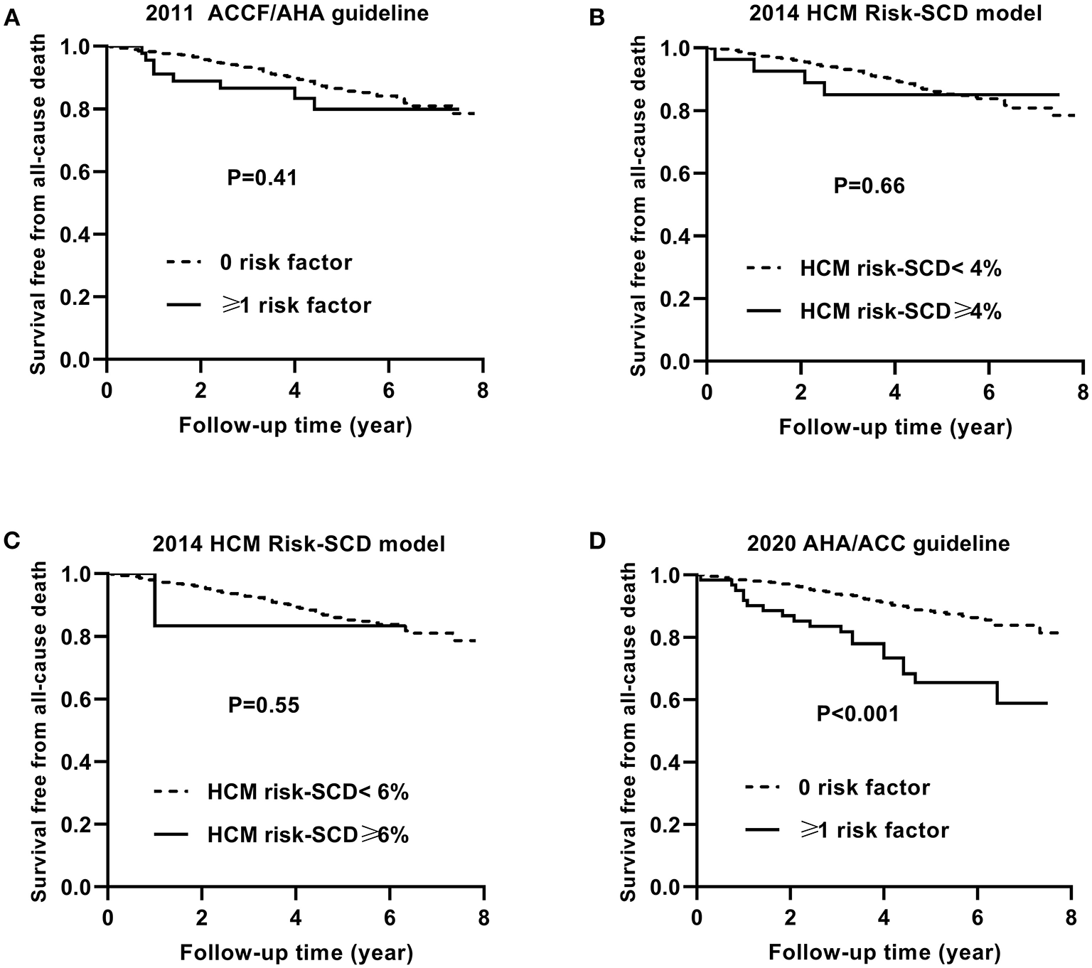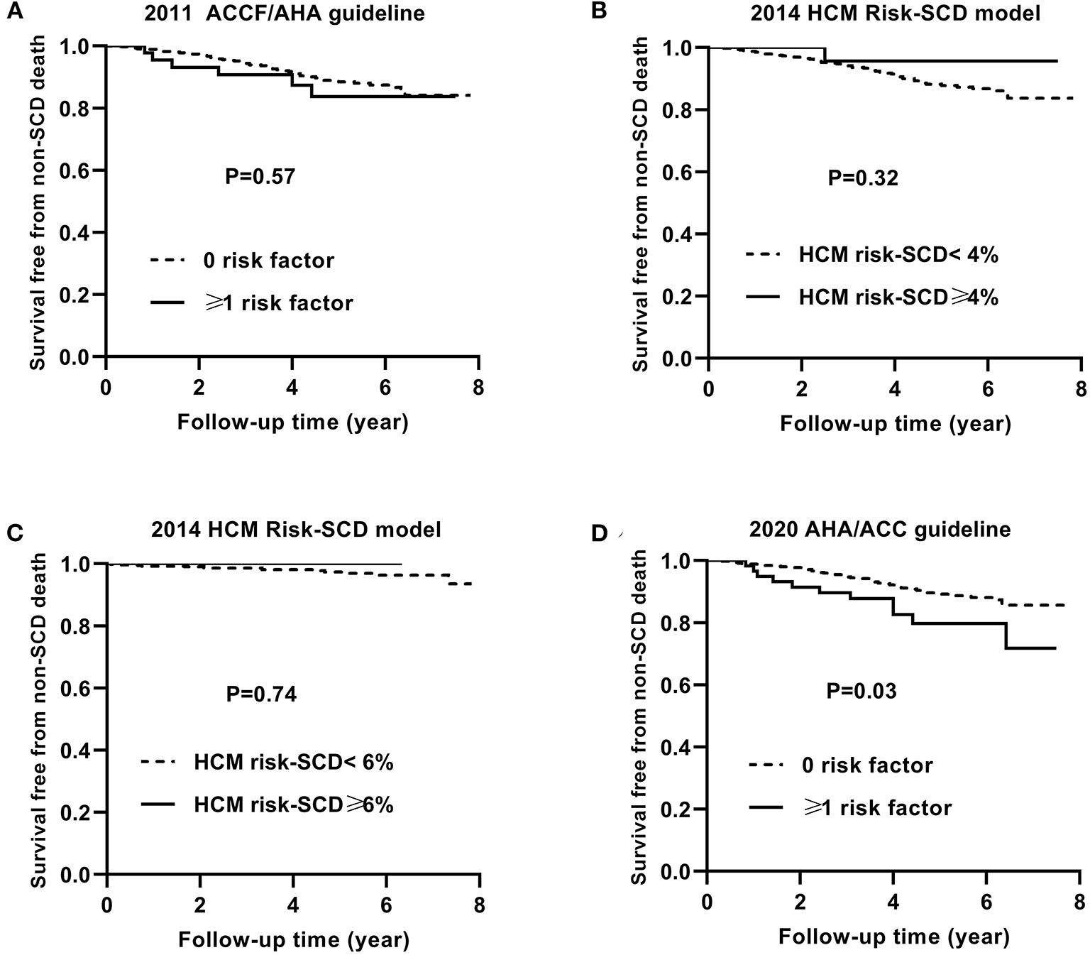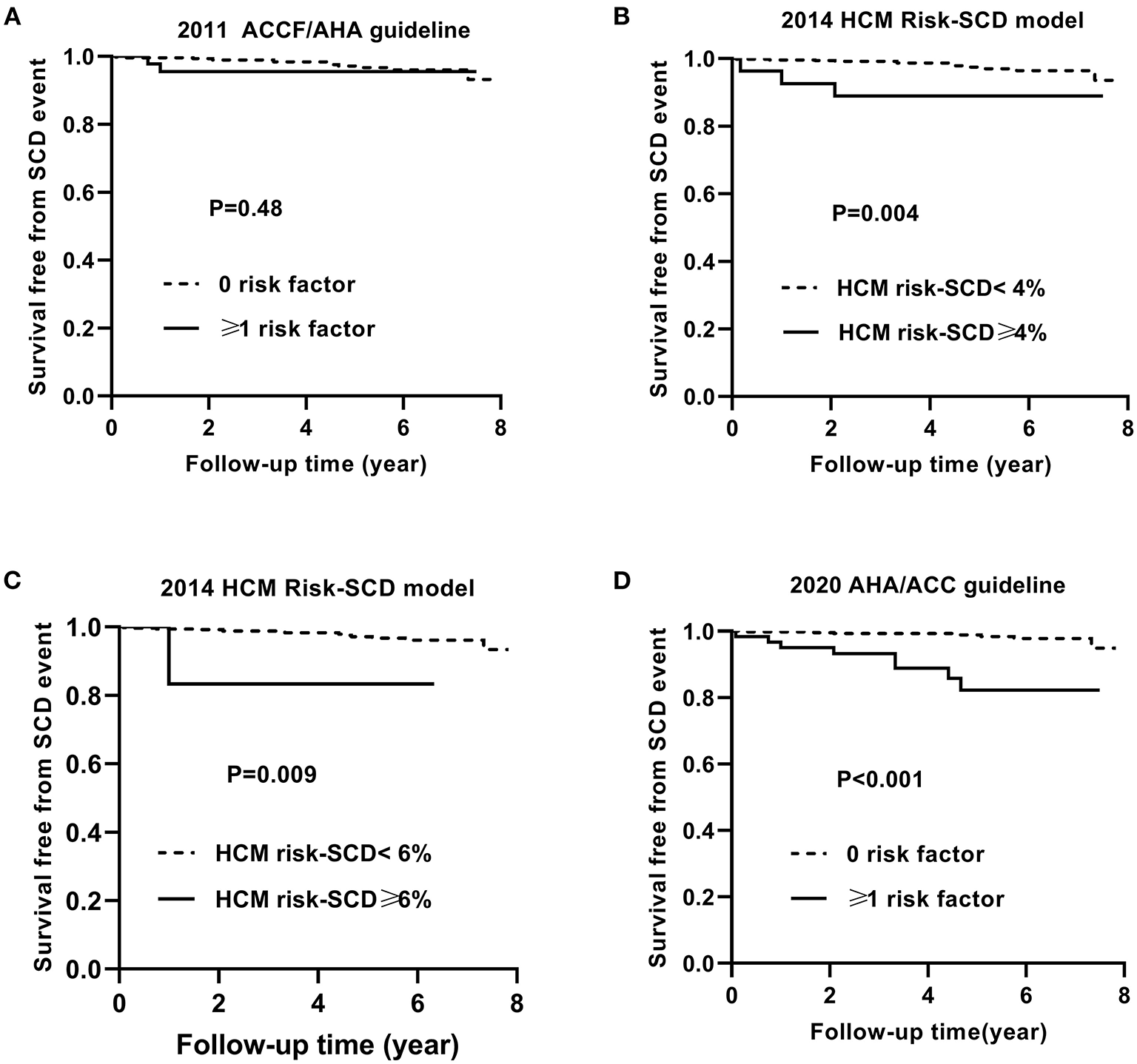 Figure 3 shows the Kaplan–Meier curves for survival free from the endpoint of SCD event based on the 2011 ACCF/AHA guideline (A), the 2014 ESC model with a cut-off level of 4% (B) and 6% (C), and the 2020 ACC/AHA guideline (D).