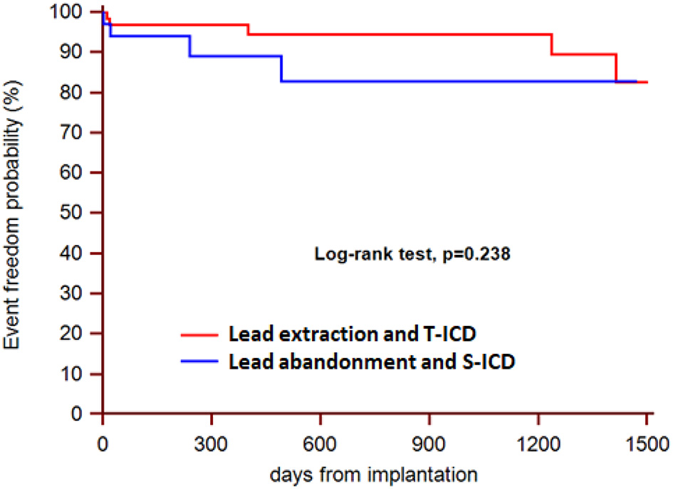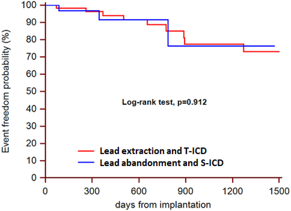 Results: Forty-three patients underwent S-ICD implantation after abandonment of malfunctioning leads, while 62 patients underwent extraction and subsequent reimplantation of a new T-ICD. The two groups were comparable. In the extraction group, no major complications occurred during extraction, while the procedure failed and an S-ICD was implanted in 4 patients. During a median follow-up of 21 months, 3 major complications or deaths occurred in the S-ICD group and 11 in the T-ICD group (HR 1.07; 95% CI 0.29–3.94; P = 0.912). Minor complications were 4 in the S-ICD group and 5 in the T-ICD group (HR 2.13; 95% CI 0.49–9.24; P = 0.238).