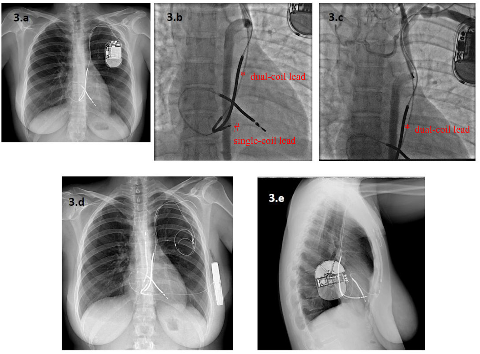 A 33-year-old woman with a Long QT Syndrome received a single-chamber T-ICD and a dual-coil lead via a persistent left superior vena cava (PLSVC) after a cardiac arrest. A new single-coil ICD lead was added five years later owing to malfunction of the first one, which was abandoned (a). After seven years, the second ICD lead also malfunctioned. Angiography showed complete occlusion of the PLSVC, with a variant venous circulation from an accessory hemiazygos vein. The dual-coil ICD lead (*) and the single-coil lead (#) are visible in (b,c). In this setting, lead extraction was considered to be at very high risk of venous laceration, while implantation of a new lead from the right side was deemed inappropriate because of the patient's young age. Finally, an S-ICD was implanted and both leads were abandoned (d,e). * dual-coil lead # single-coil lead.