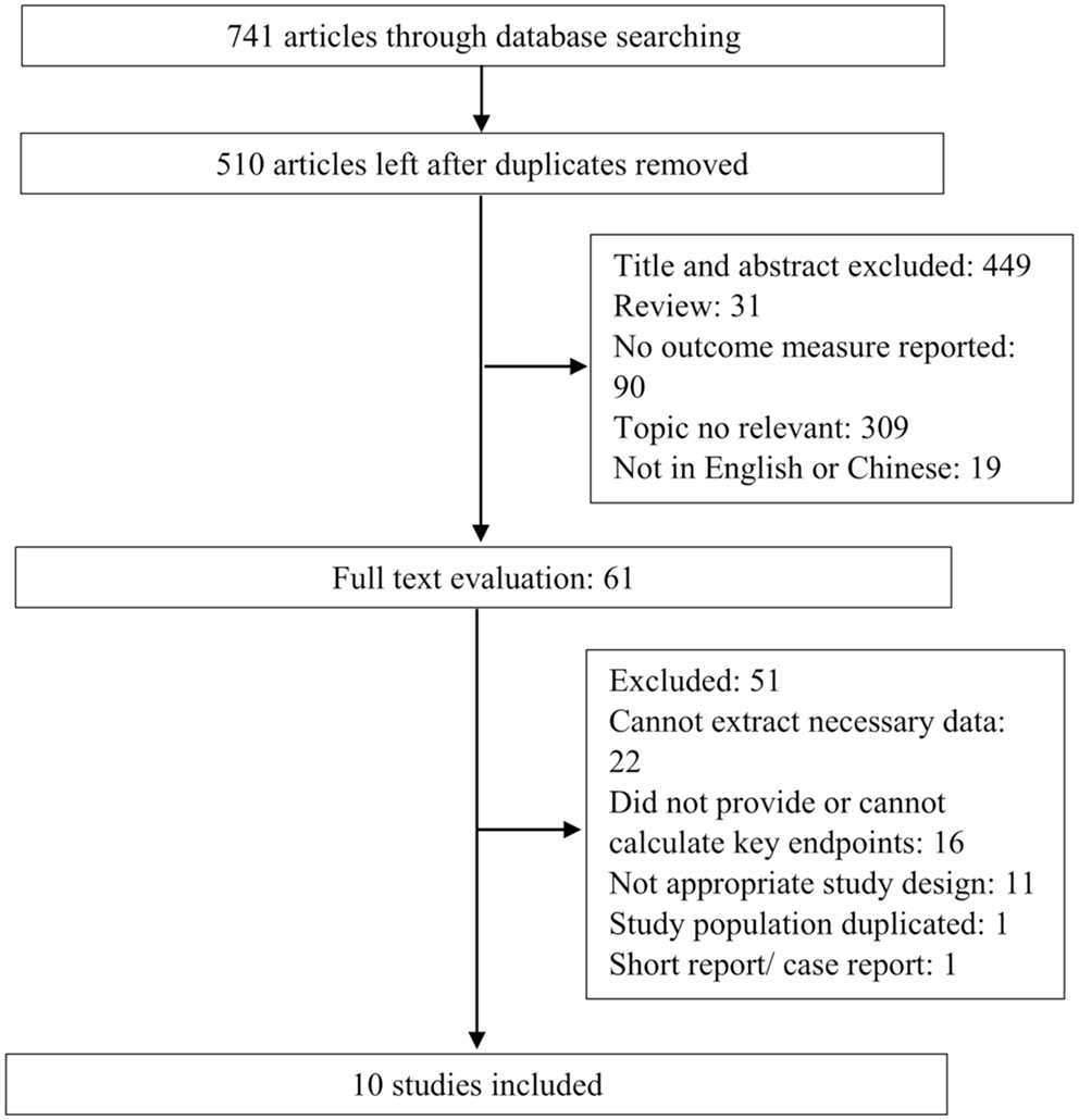 The flowchart of the study selection process is shown in Figure 1. The systematic literature search yielded 741 studies, and 231 of these were excluded due to duplication. Based on the inclusion and exclusion criteria, 449 abstracts and titles were excluded. A total of 61 full-length manuscripts were retrieved, with 11 excluded due to inappropriate study design including enrolled cases with multiple comorbidities and cases receiving treatments. Ultimately, 10 articles (6, 11, 12, 18–24) were included for data extraction and meta-analysis.