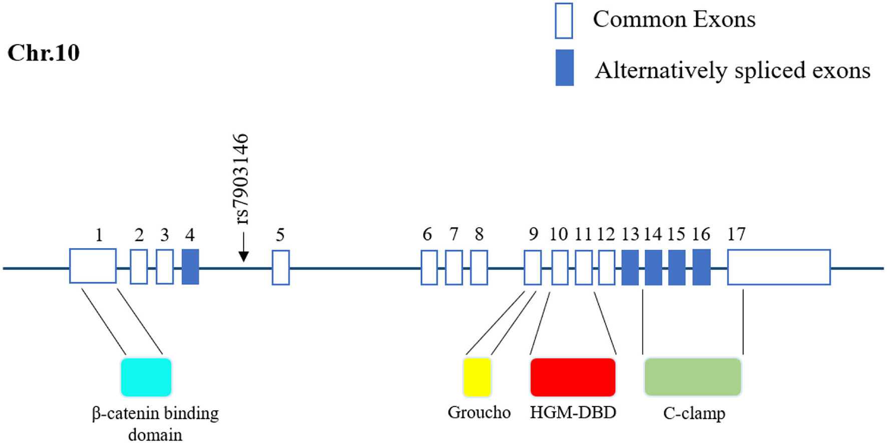 Location of rs7903146 in human TCF7L2. Representative 17 exons and location of rs7903146 on human TCF7L2. Alternatively spliced exons are colored, and the black arrow represents alternative transcription start sites. rs7903146 is located in exon 4 of TCF7L2. TCF7L2 comprises several domains, including the β catenin-binding domain, Groucho-binding sequence, HMG box-DNA-binding domain (HGM-DBD), and cysteine clamp (C-clamp).