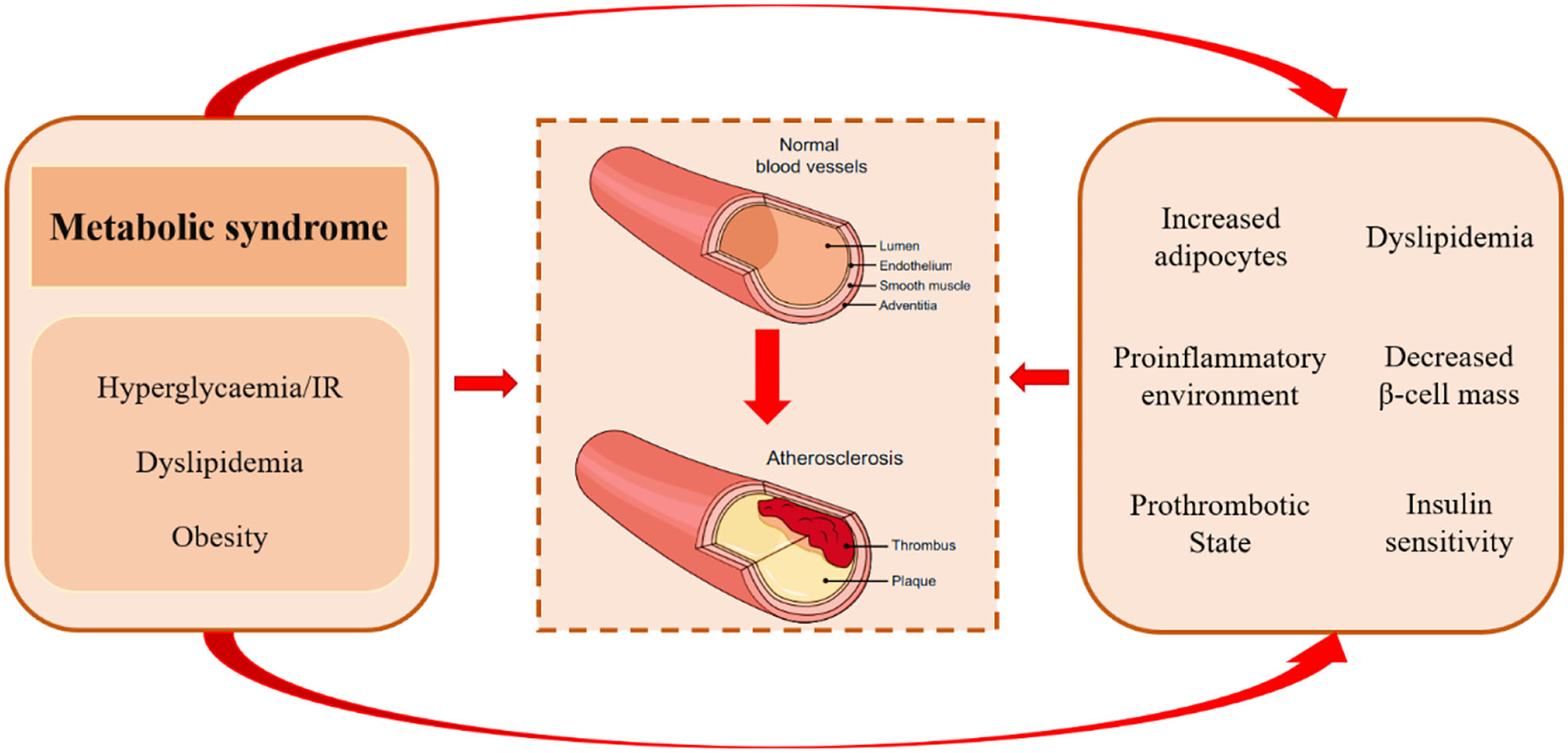 Pathological mechanisms of atherosclerosis in metabolic syndrome. Metabolic syndrome comprises a complex group of metabolic disorders characterized by hyperglycemia/insulin resistance, dyslipidemia, and obesity. It may accelerate atherogenic progression via increased adipocytes, proinflammatory environment, prothrombotic state, excess concentration of free fatty acids, unfavorable lipidomics, and decreased insulin levels and insulin sensitivity.