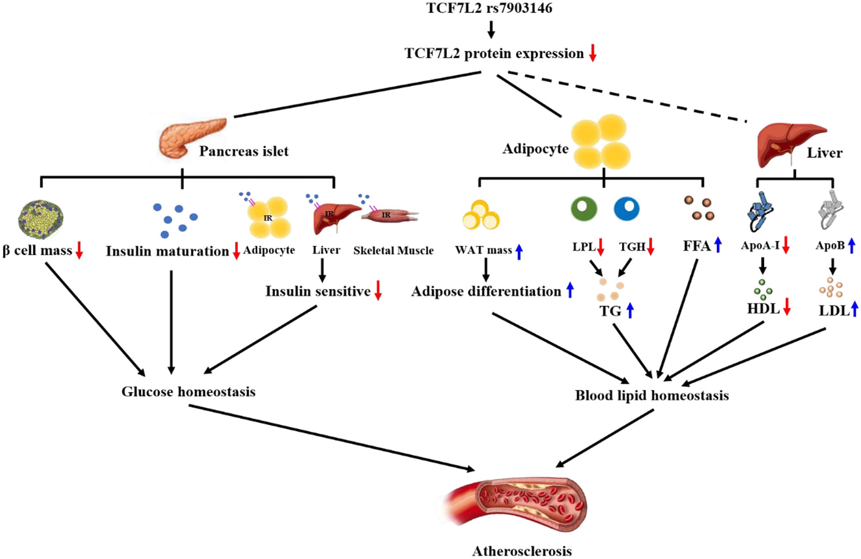 TCF7L2 rs7903146 is a link between metabolism disorders and atherosclerosis. TCF7L2 rs7903146 inhibits the expression of TCF7L2, thereby influencing glucose and blood lipid homeostasis. On the one hand, TCF7L2 rs7903146 induces hyperglycemia and insulin resistance by decreasing β-cell mass, proinsulin gene expression, Ca2+ voltage-gated channel activity, and insulin sensitivity of cells. On the other hand, TCF7L2 rs7903146 disrupts blood lipid homeostasis by increasing white adipocyte tissue (WAT) mass and harmful lipid components and decreasing HDL levels.