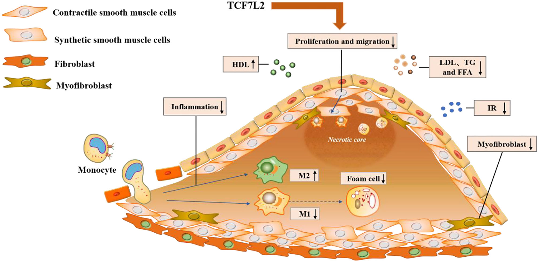 Molecular mechanisms underlying the action of TCF7L2 in anti-atherosclerosis. TCF7L2 exerts a protective role in atherosclerosis through multiple molecular mechanisms, including the inhibition of inflammation, VSMC proliferation and migration, dyslipidemia, insulin resistance, and foam cell and myofibroblast formation.