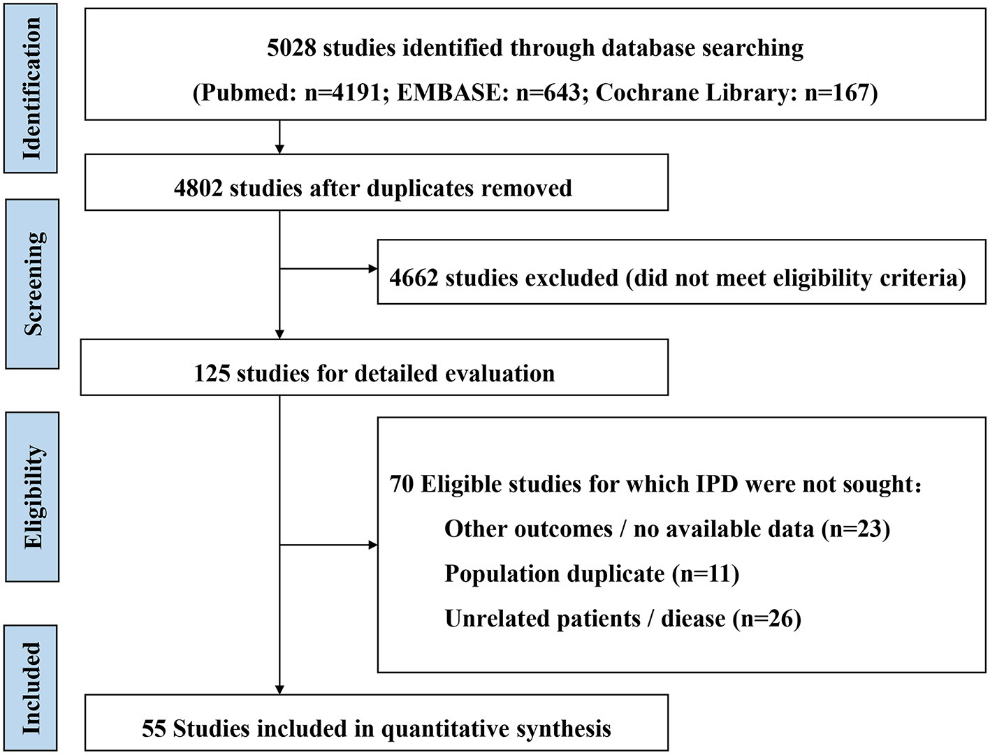 A total of 5,028 unique records were identified from the literature search. After excluding 226 duplicate articles, 125 studies were initially included by reading the title and abstract. Fifty-five studies were finally included after further reading the full text, including six RCT post-hoc studies (15–20) and 49 cohort studies (3, 5–8, 21–64) (Figure 1).
