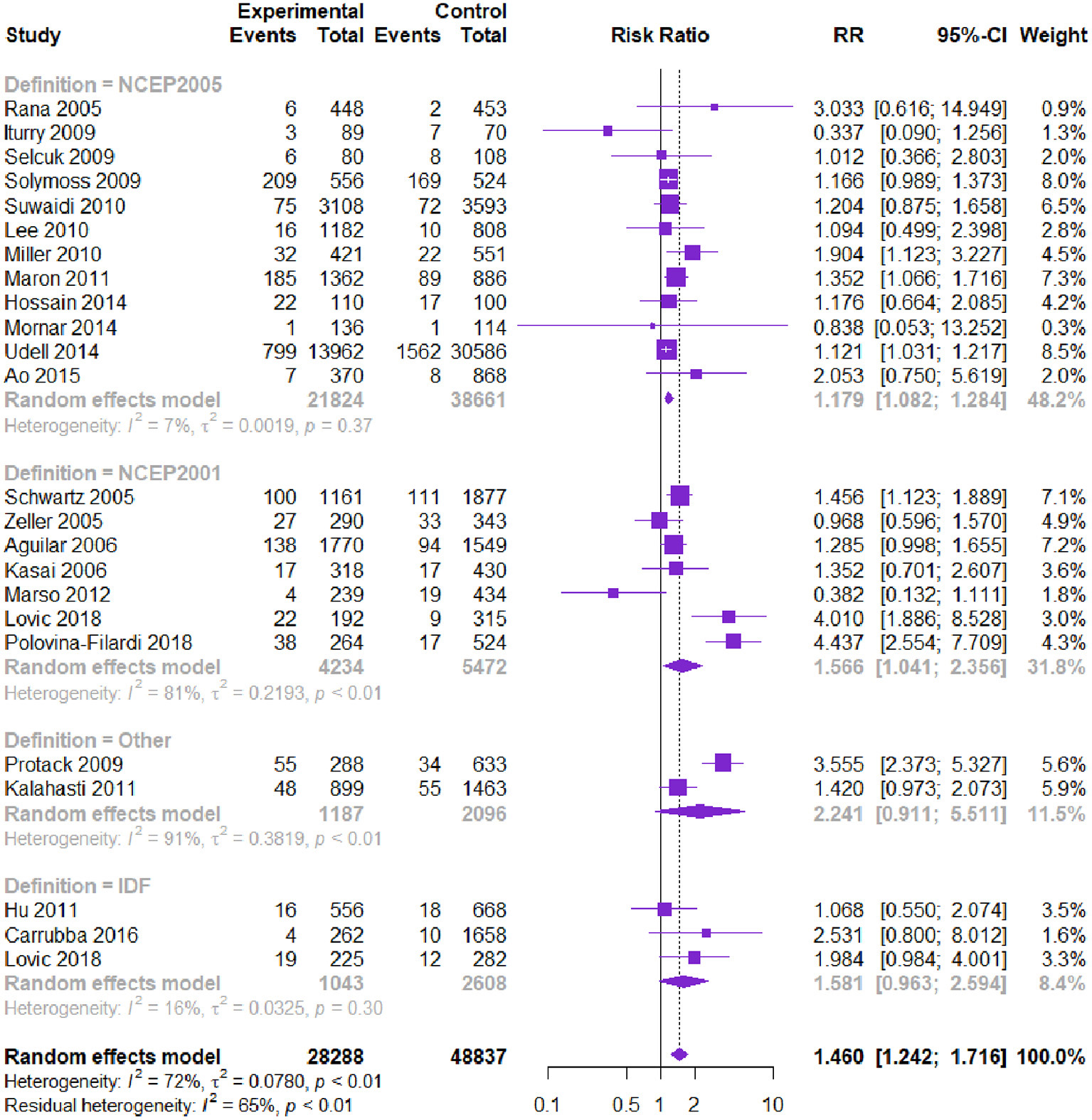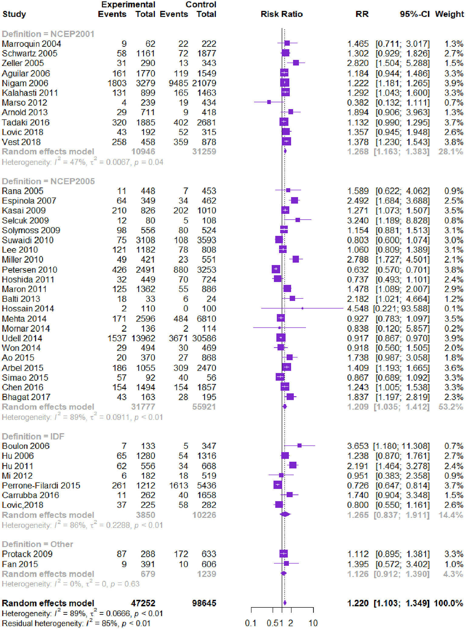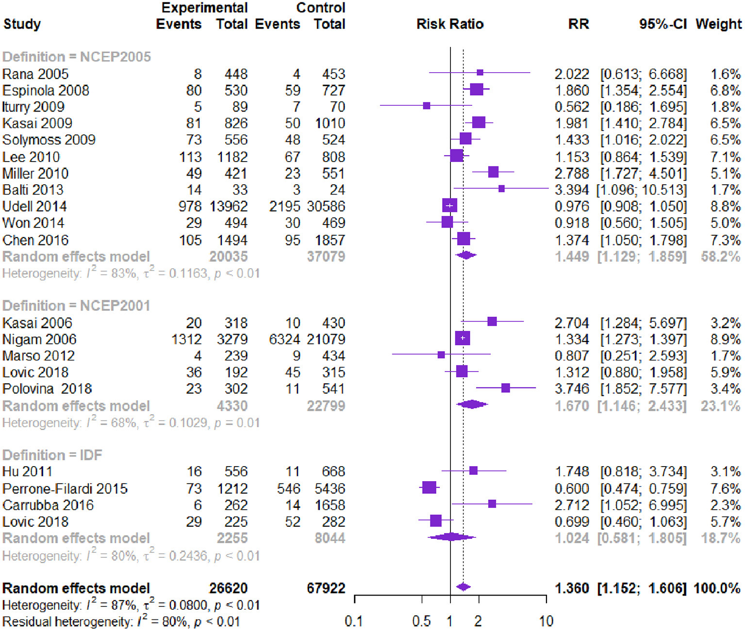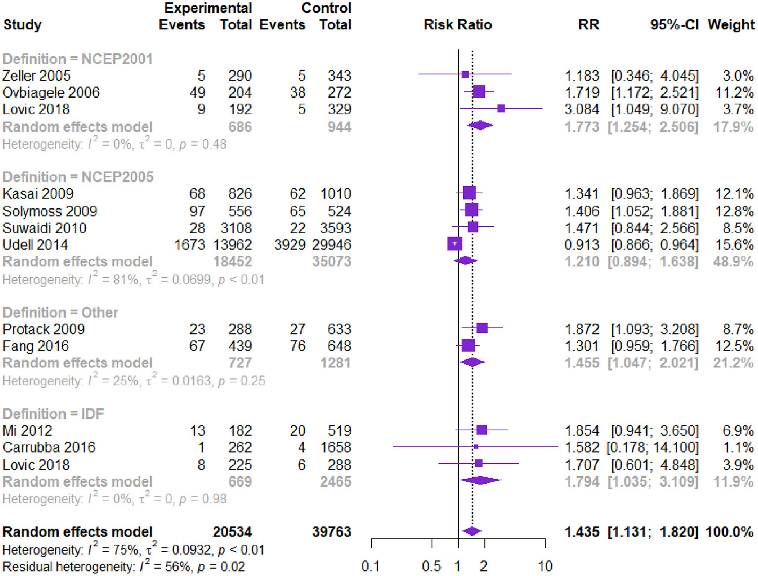 To explore the sources of clinical heterogeneity and methodological heterogeneity, we performed subgroup analysis based on the following: (1) diagnostic criteria, studies were divided into four subgroups (NCEP2001, NCEP2005, IDF and “others”) and (2) study type, studies were divided into three subgroups (prospective cohort study, retrospective cohort study, and RCT post-hoc study). Meta-regression analysis of three covariates (follow-up time, male proportion, and patient age) was performed to explore the size and source of heterogeneity.