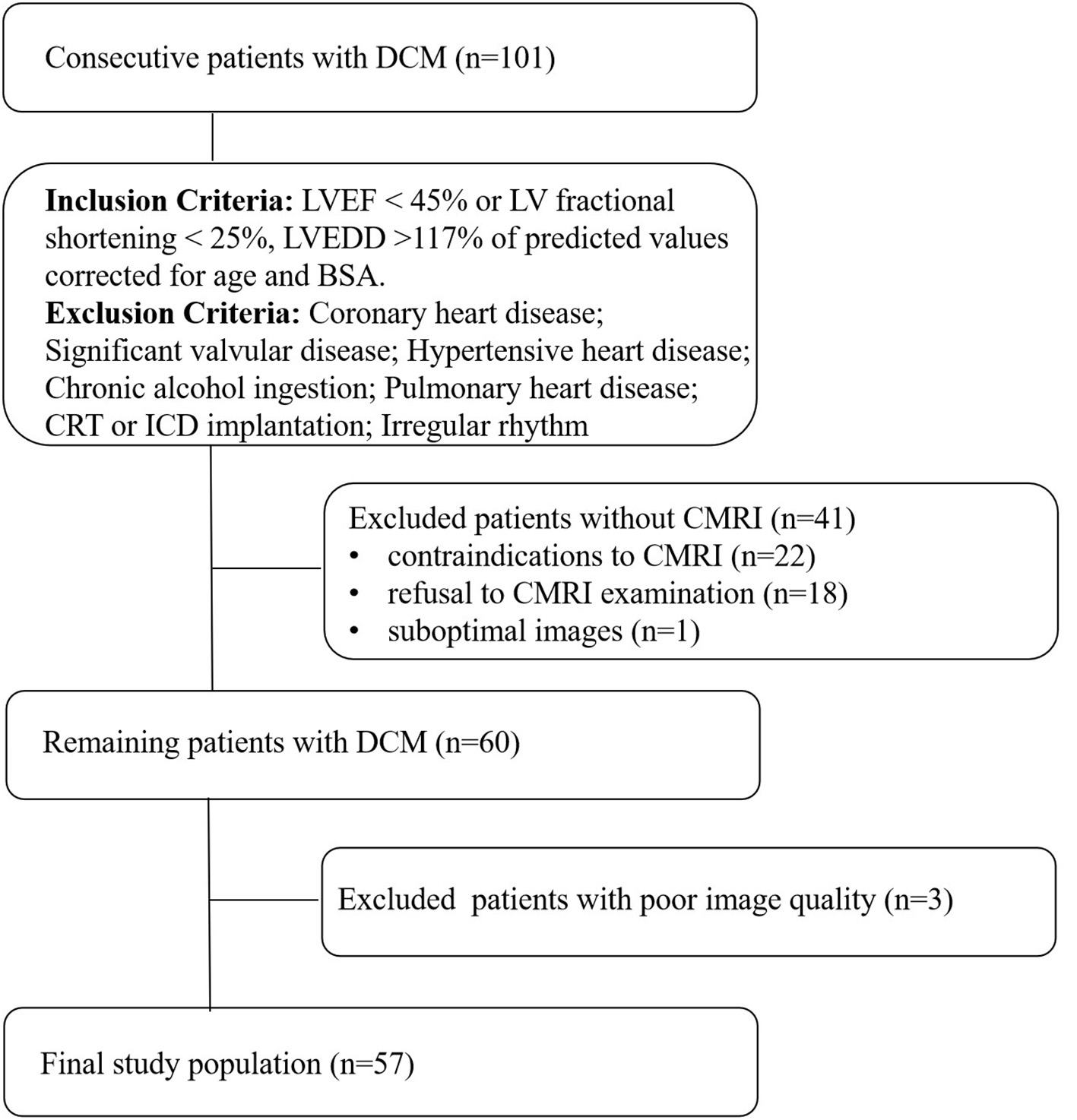 We conducted a prospective study on 101 consecutive patients with DCM in the heart failure department of Fuwai Central China Cardiovascular Hospital from January 2019 to February 2021. The diagnosis of DCM was established according to current guidelines (14). The inclusion criteria were: (1) LV ejection fraction (LVEF) ≤ 45% or LV fractional shortening <25%; (2) LV end-diastolic diameter > 117% of predicted values corrected for age and body surface area (BSA), both echo-determined. Patients with coronary heart disease (> 50% angiographical stenosis in any epicardial coronary artery, and patients with an ischemic scar at cardiac MRI), hypertensive heart disease, significant valvular disease (valvular stenosis or > mild functional regurgitation), chronic alcohol ingestion, pulmonary heart disease, congenital heart disease, a history of cardiac resynchronisation therapy (CRT) and implantable cardioverter defibrillator (ICD) implantation, or irregular rhythm were excluded. The 41 patients who had not undergone a CMRI were excluded. Finally, 3 patients were excluded from this study because of poor image quality. The final analysis included 57 DCM patients (Figure 1).