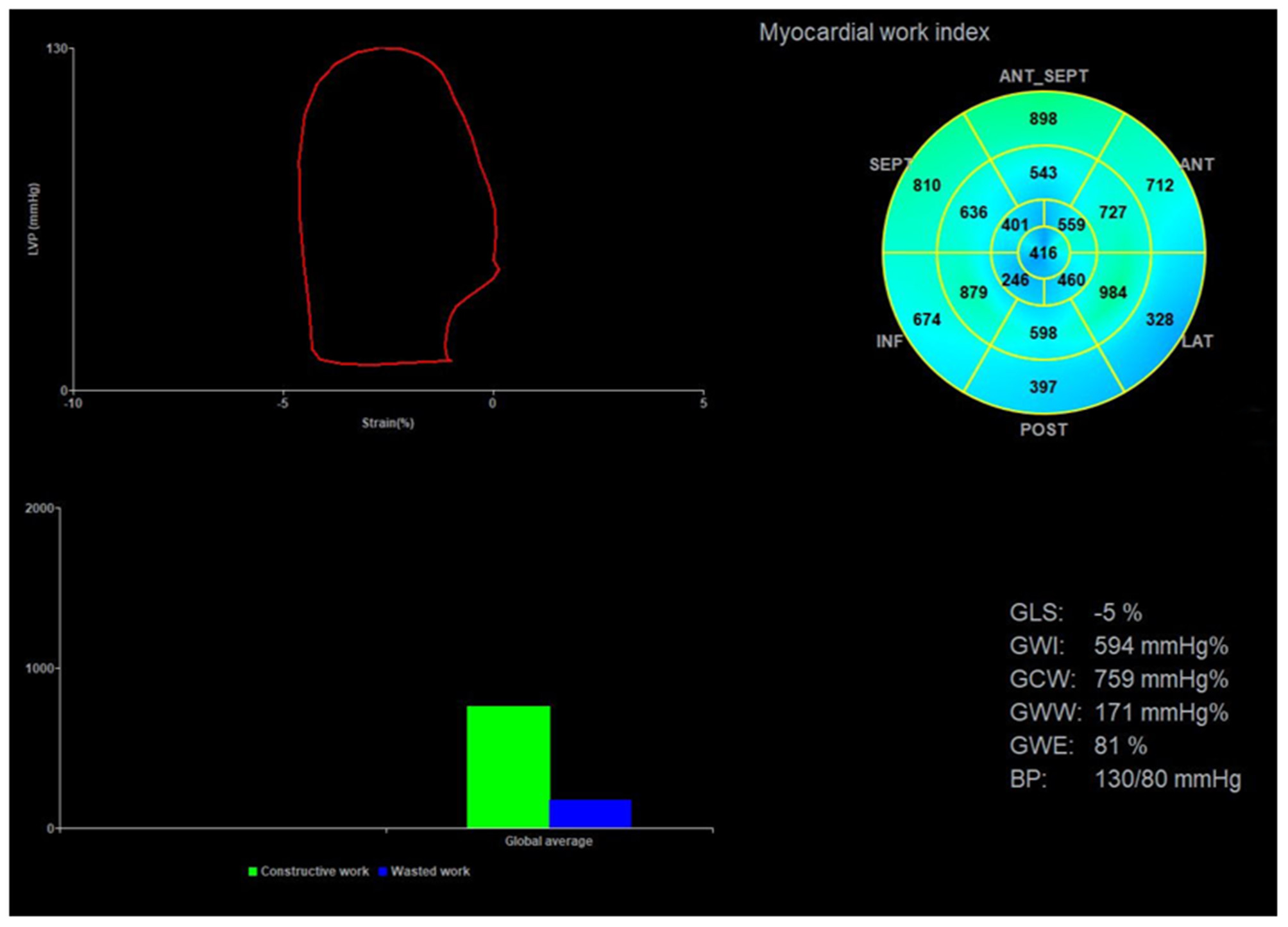The left ventricular ejection fraction (LVEF) and global longitudinal strain (GLS) measured using echocardiography are often recommended for the evaluation of left ventricular systolic function (LVSF) (10). However, LVEF and GLS are susceptible to cardiac load. The myocardial work index derived from the left ventricular pressure-strain loop (LVPSL) is a new method for non-invasive assessment of LVSF (11). This technique is derived from the 2D speckle tracking technique, and it considers the effect of afterload on strain. The method is simple, easy, and non-invasive, and it could be widely used in clinical practice.