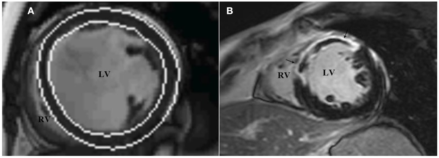 LV function and LGE analysis via cardiac magnetic resonance imaging. The analysis software automatically tracks the left ventricular endocardium and epicardium to measure left ventricular volume (A), and assesses the presence and distribution of left ventricular LGE through short-axis images (B), which show high signal intensity in the middle segment of the left ventricular septum, anterior wall. LGE, late gadolinium enhancement.