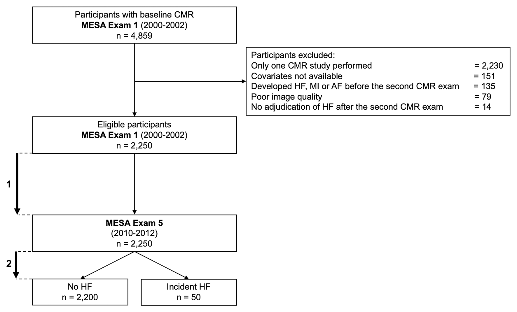 A flowchart of the MESA population investigated in the current study is depicted in Figure 1. Participants were excluded if: (i) they did not have the second CMR exam, (ii) their images were missing or not of sufficient quality to allow measurement of LA and LV volumes, or (iii) they developed incident HF, myocardial infarction, or atrial fibrillation, including patients who had HF during AF, between Exam 1 and Exam 5 (Figure 1). Of note, incident HF between Exam 1 and Exam 5 was defined as any episode of acute HF irrespective of its etiology, including acute HF secondary to other cardiac conditions. Of the 4,859 participants with baseline CMR that included LA volume assessment (Exam 1), 2,250 participants returned for a second CMR exam at Exam 5 after a mean time of 9.6 ± 0.6 years and were included in the study.