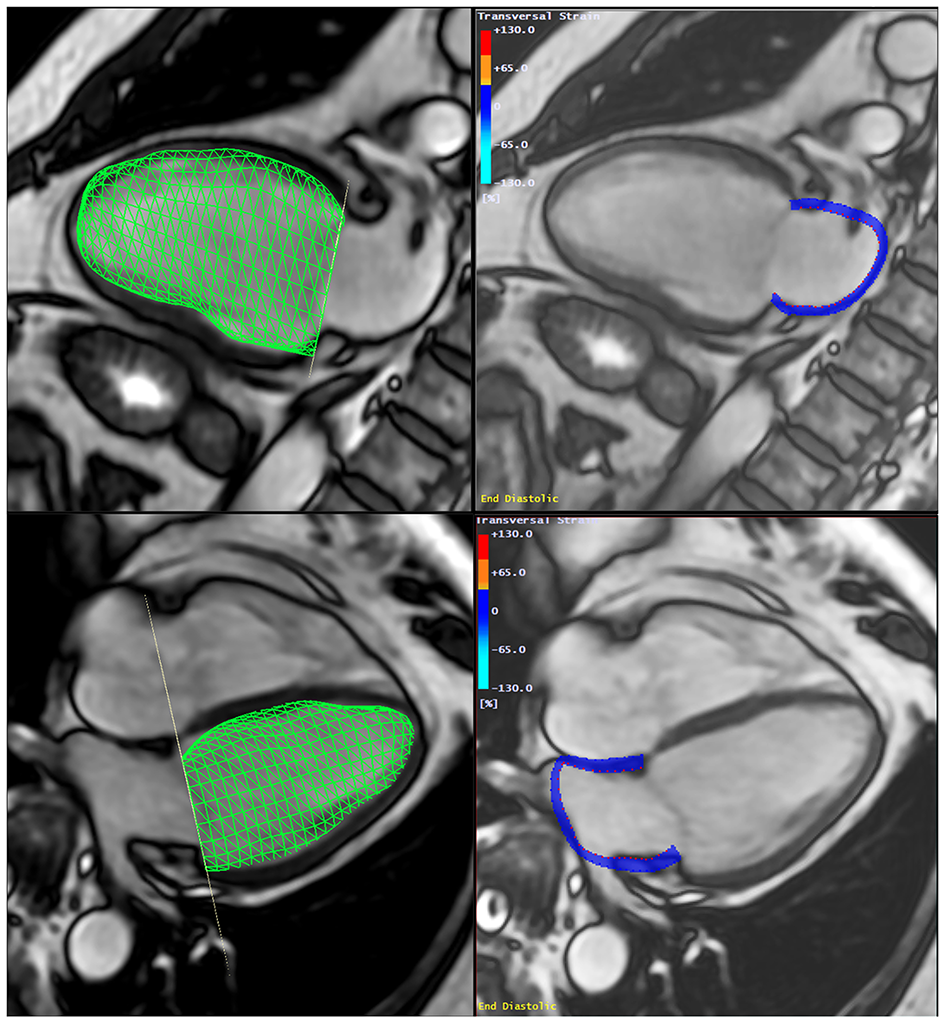 Multimodality tissue tracking software (MTT version 6.0, Toshiba Medical Systems Corporation, Tokyo, Japan) was used to quantify LA volume and strain from 2- and 4-chamber cine CMR images (Supplementary File 2). This method has been validated previously with good to excellent intra- and inter-reader reproducibility with intraclass correlation (ICC) of 0.88 to 0.98 (p < 0.001), and good inter-study reproducibility with ICC of 0.44 to 0.82 (p < 0.05 to 0.001) (24–26). A single experienced operator, blinded to the participant's case status, defined endocardial and epicardial borders of the LA at end-systole. Using the marked points, the software creates endocardial and epicardial borders, then tracks LA tissue in subsequent frames. The endocardial and epicardial contours generated by the software are then followed by the operator during the cardiac cycle for quality control.