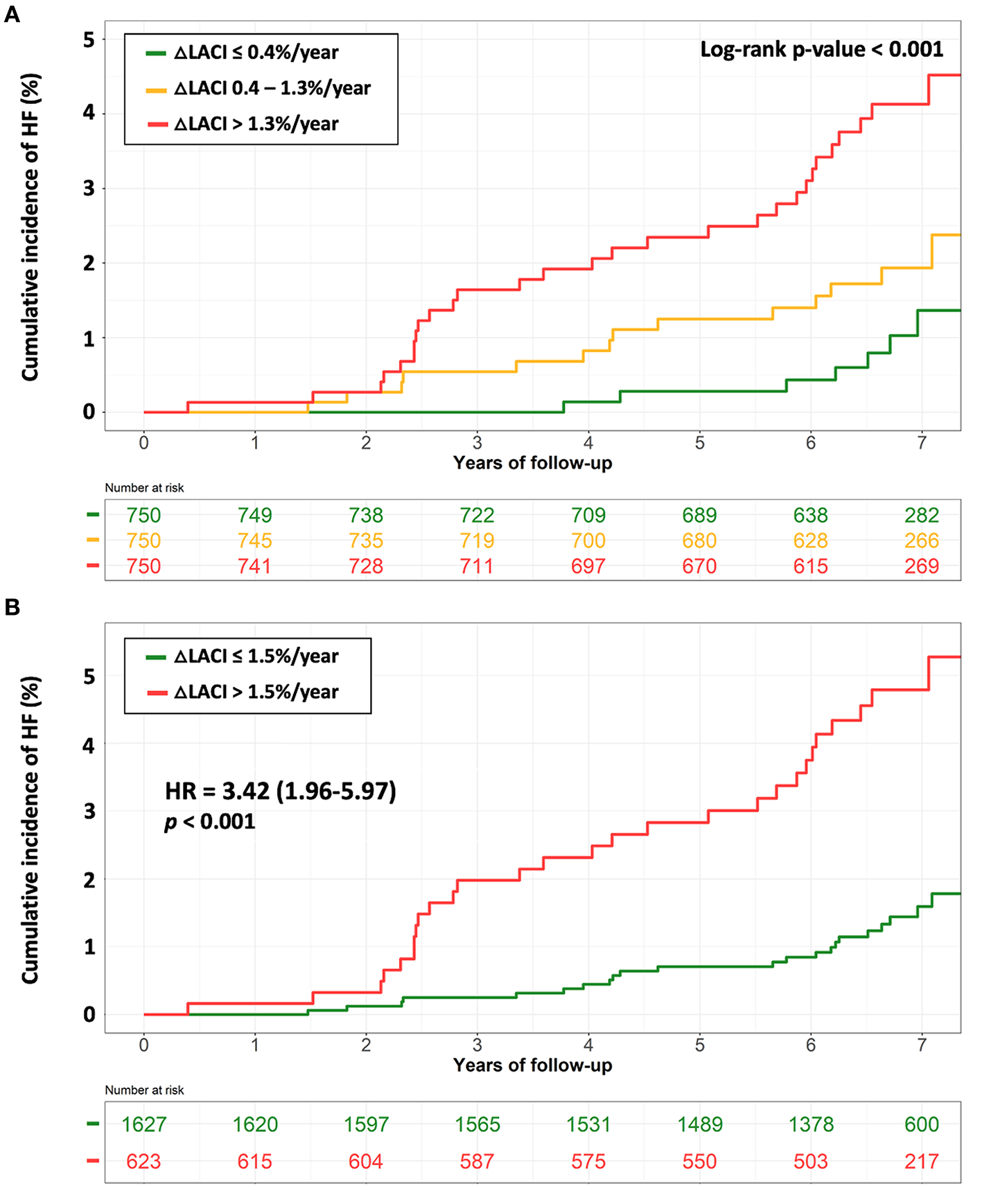 The survival tree method was used to determine the cut-off to transform the LACI and ΔLACI into a binary variable with the best predictive value for HF. A two-tailed p-value <0.05 was considered statistically significant. All data were analyzed using R software, version 3.6.1 (R Project for Statistical Computing).
