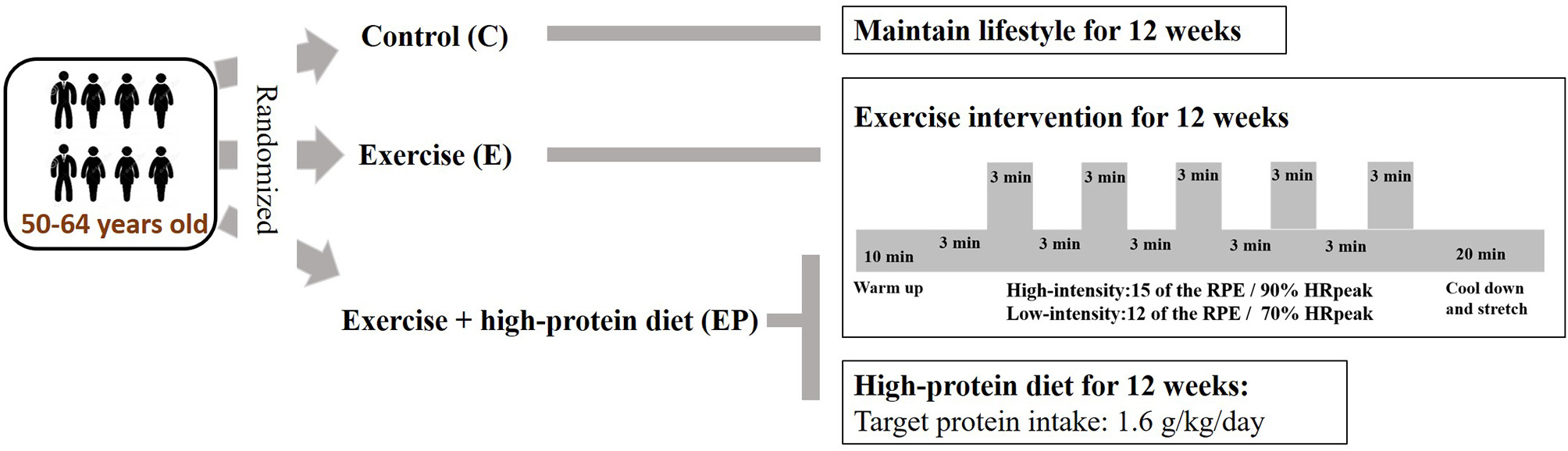 As shown in the Figure 1, individuals in the E and EP groups received supervised exercise training on the spin bikes in a fitness room. The duration of each session was 60 min, including 10 min of warm-up, 30 min of high-intensity interval training (HIIT), and 20 min of cool-down and stretching. High-intensity interval training consisted of 5 cycles of 3-min of high-intensity exercise and 3-min of low-intensity exercise. The high-intensity was set at 90% of HRpeak or at 15 of the Borg 6-to-20 rating of perceived exertion (RPE) scale. The low-intensity was set at 70% HRpeak or at 12 of the RPE scale. A graded exercise test on a cycle ergometer with a metabolic system (Cortex Metalyzer 3B, Germany) was used to determine the HRpeak. Heart rate monitors (Polar RS400, USA) were used to ensure participants exercised at the target exercise intensity. The average attendance rate of exercise training of the E and EP groups was 90 and 94%, respectively. The average HR at the high-intensity component of HIIT was 91% HRpeak and 90% HRpeak for the E and the EP groups, respectively. The attendance rates and training intensity were similar between the E and the EP groups.