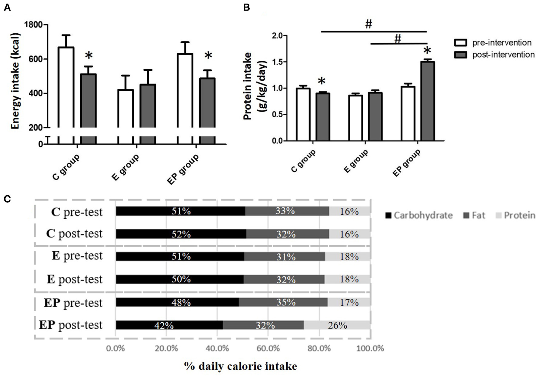 Daily energy intake of participants before and after intervention. (A) Daily energy intake. (B) Daily protein intake. (C) The percentage of macronutrients of daily energy intake. Data were presented as mean ± SE or percentage. C, control group; E, exercise group; EP, exercise combined with high-protein diet group. *Significant change from the baseline. #Significantly different between groups.