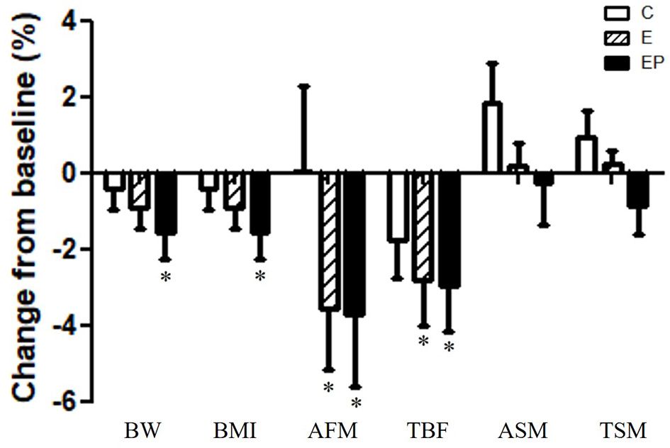 Effects of intervention on body composition. Data were presented as mean ± SE. *Significant change from the baseline; AFM, abdominal fat mass; ASM, appendicular skeletal muscle mass; BMI, body mass index; BW, body weight; C, control group; E, exercise group; EP, exercise combined with high-protein diet group; TBF, total body fat mass; TSM, total skeletal muscle mass.