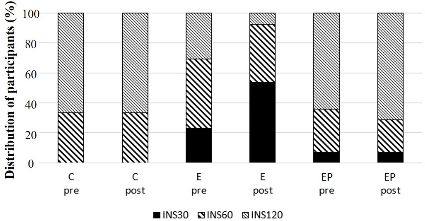 Glucose homeostasis is a key marker of cardiometabolic health of individuals (36). We found that fasting glucose levels, fasting insulin levels, and AUCs of glucose and insulin were similar among groups after intervention (p > 0.05). Within-group comparisons showed that the 2-h glucose of OGTT decreased 10% in the EP group after intervention (p < 0.05), but the values did not change in the C and E groups after intervention (p > 0.1). The ISI0,120 increased 11.5% in the EP group and had a trend to increase in the E group (p = 0.052) (Table 2). Regarding the insulin-peak-time, the percentages of individuals having insulin-peak-time at 30, 60, or 120 min of OGTT were different among groups after intervention (p = 0.031). In the E group, the percentage of individuals having insulin-peak-time at 30 min increased from 25 to 50%, and the percentage of individuals having insulin-peak-time at 120 min decreased from 37.5 to 12.5% after the intervention. The pattern of insulin-peak-time did not change in the C and EP groups (Figure 4).