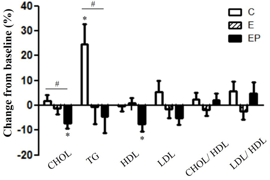 Effects of intervention on lipid profiles. Data were presented as mean ± SE. #Significantly different between groups analyzed by ANCOVA and the Bonferroni test; *Significant change from the baseline. C, control group; CHOL, total cholesterol; E, exercise group; EP, exercise combined with high-protein diet group; HDL, high-density lipoprotein; LDL, low-density lipoprotein.