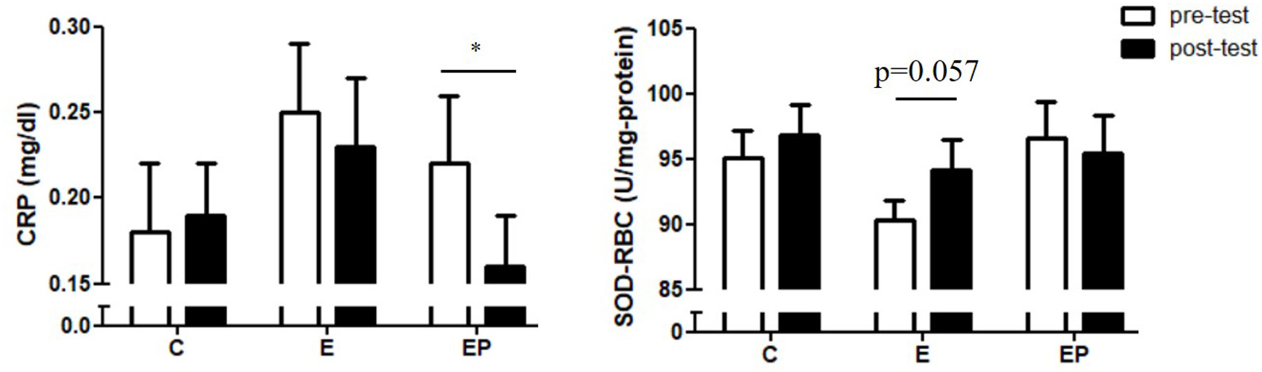 Effects of intervention on inflammatory and oxidative stress markers. Data were presented as mean ± SE. C, control group; CRP, C-reactive protein; E, exercise group; EP, exercise combined with high-protein diet group; SOD-RBC, superoxide dismutase activity in red blood cells. *p < 0.05.
