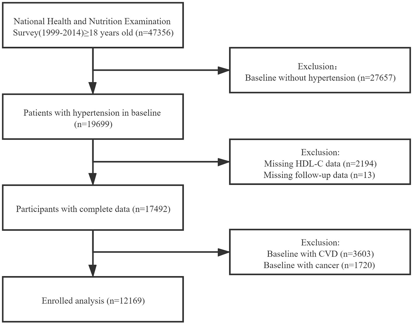 We extracted the data of study population from National Health and Nutrition Examination Surveys (NHANES) 1999-2014. NHANES, conducted by the National Center for Health Statistics, is a series of nationwide surveys to evaluate the health status of the US citizens. The Centers for Disease Control and Prevention has ratified the study protocols, and all participants have provided informed consents. The total number of the participants in the survey is 47,356. After excluding the participants in baseline without hypertension (n = 27,657), missing HDL-C data (n = 2,194) or follow-up data (n = 13), and those in baseline with CVD or cancer, a total number of 12,169 individuals were enrolled in our formal analysis (Figure 1).