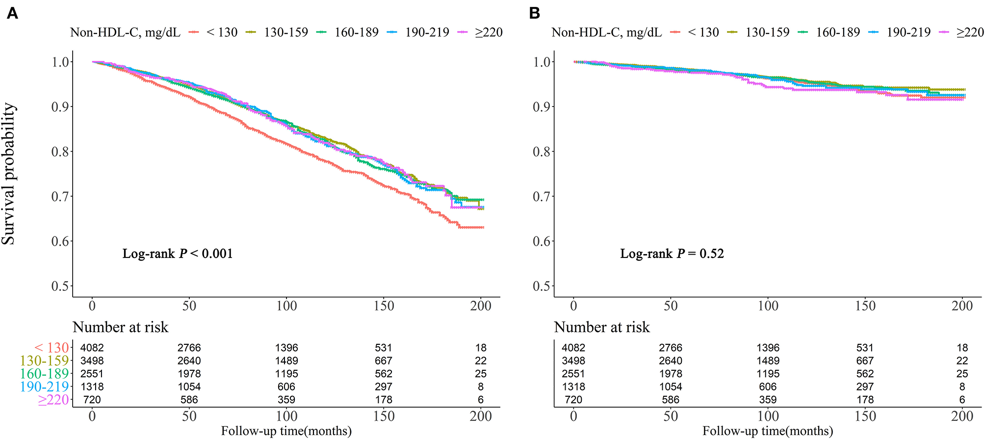 Kaplan–Meier survival curve for all-cause (A) and cardiovascular (B) mortality by non-HDL-C.