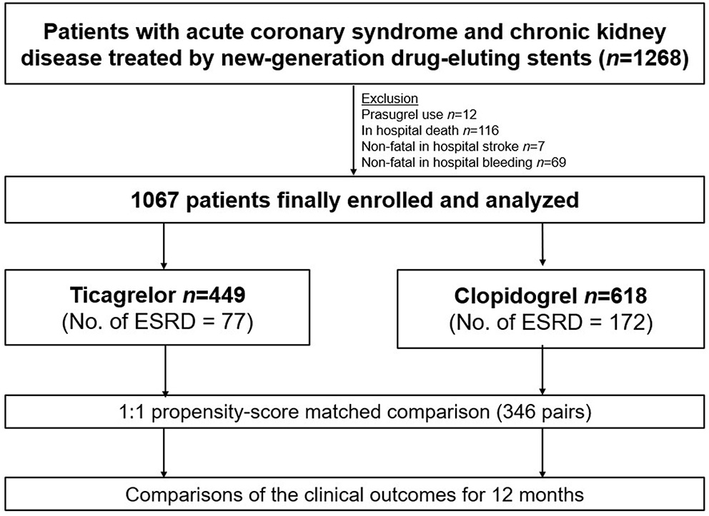 Several studies suggest that ticagrelor has superior efficacy over clopidogrel in reducing the risk of major adverse cardiovascular events in patients with acute coronary syndrome (ACS) (1–3). Current guidelines recommend dual antiplatelet therapy (DAPT) with a combination of aspirin and a potent P2Y12 inhibitor for 12 months in the era of new-generation drug-eluting stent (DES) (4–6). However, although chronic kidney disease (CKD), including end-stage renal disease (ESRD), is a well-documented risk factor for recurrent ischemic major adverse cardiac and cerebrovascular events (MACCEs) and bleeding events (7, 8), the optimal antiplatelet strategy for patients with CKD remains unclear due to the lack of clinical trial-based evidence (4, 8). The present study aimed to compare clinical outcomes of patients with ACS and CKD treated with the new-generation DES, stratified by CKD stage, and dichotomized based on P2Y12 inhibitor type used in DAPT (ticagrelor vs. clopidogrel).