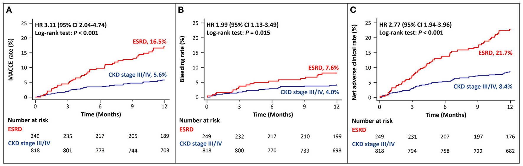 Twelve-month cumulative incidence of major adverse cardiac and cerebrovascular events (A), bleeding (B), or net adverse clinical (C) events, compared between CKD stage III/IV and ESRD. MACCE, Major Adverse Cardiac and Cerebrovascular Event; CKD, Chronic Kidney Disease; ESRD, End Stage Renal Disease.