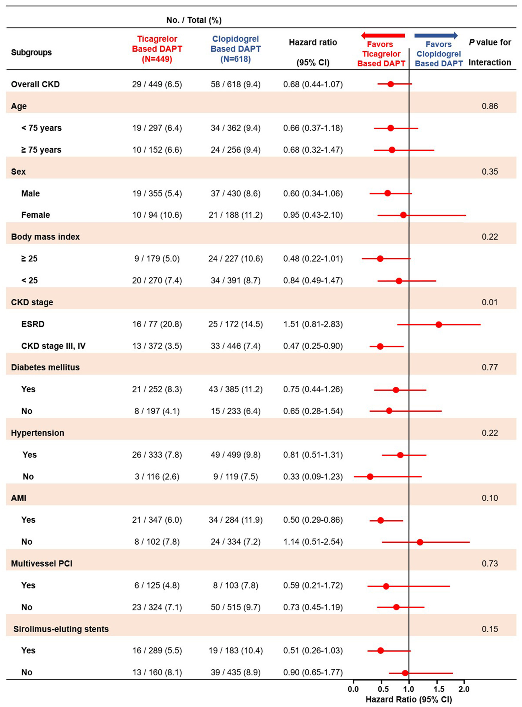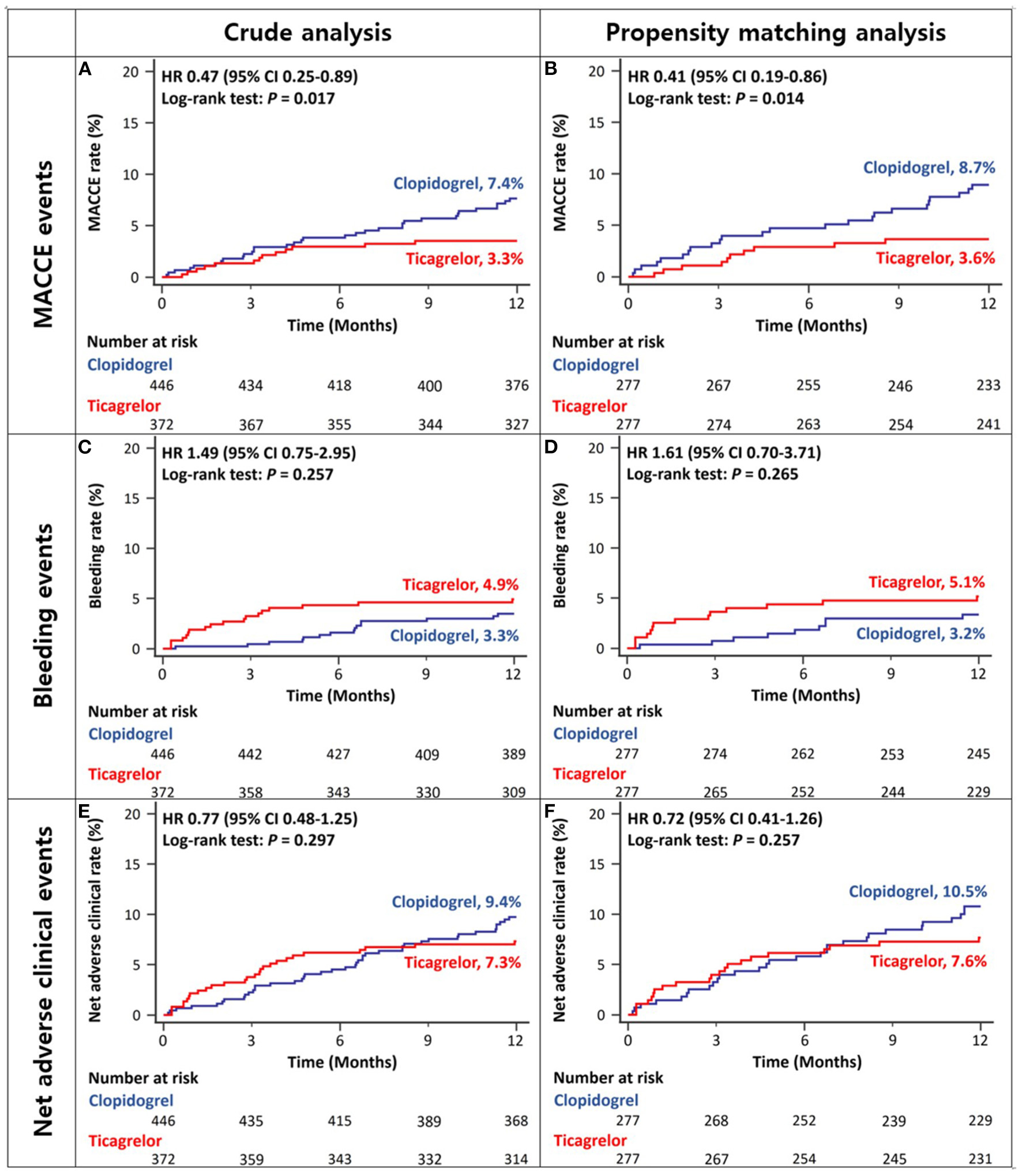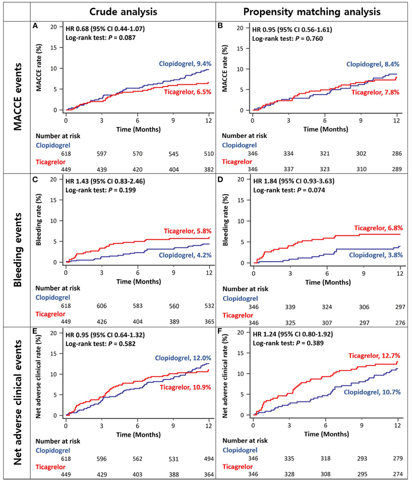 | Overall CKD patients | Ticagrelor-based DAPT (N = 449) | Clopidogrel-based DAPT (N = 618) | HR (95% CI) | P-value | Ticagrelor -based DAPT (N = 346) | Clopidogrel -based DAPT (N = 346) | HR (95% CI) | P-value |