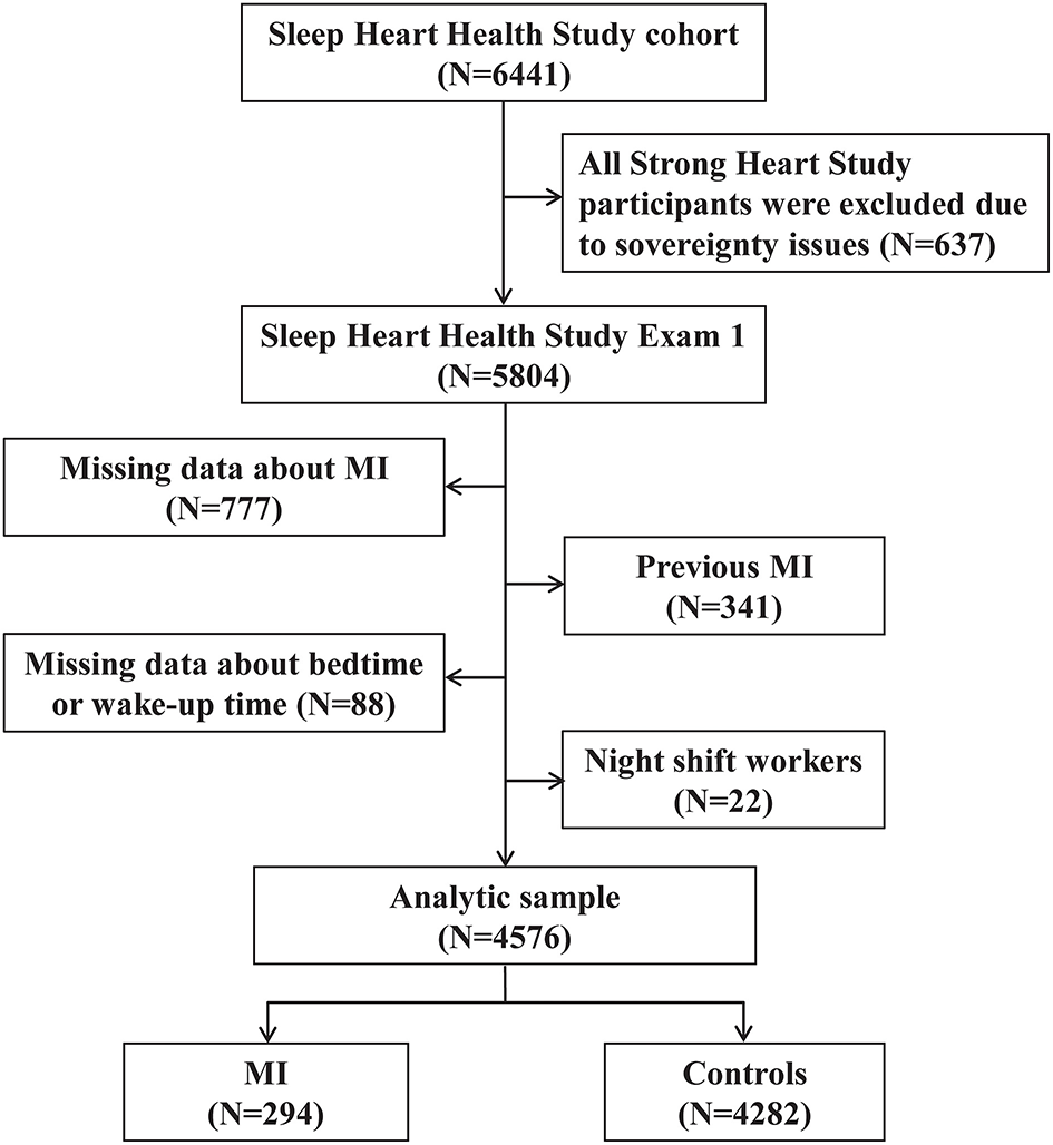 However, the association between sleep timing (including bedtime, wake-up time and sleep midpoint) and MI remains unknown. Therefore, we conducted this study to investigate the association between sleep timing and MI on the basis of a decade-long follow-up dataset from the Sleep Heart Health Study (SHHS).