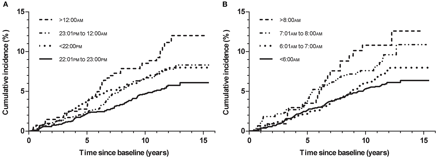 Information about the sleep timing including bedtime and wake-up time was acquired by asking the participants to complete the Sleep Habits Questionnaire at the baseline. Bedtimes were recorded using questions, such as “At what time do you usually fall asleep on weekdays and weekends, respectively (hour, minute, AM or PM)?” A similar question was also used to record the wake-up times on weekdays and weekends. In our pre-analysis, we found a U-sharp relationship between weekday bedtime and MI based on the restricted cubic spline analysis. Individuals with weekday bedtime at 10:01 PM−11:00 PM had the lowest incidence MI when compared with 12:00 AM and later, 11:01 PM−12:00 AM and 10:00 PM and before (Supplementary Figure 1). Combining the pre-analysis and previous studies, the bedtime was classified into 10:00 PM and before, 10:01 PM−11:00 PM, 11:01 PM−12:00 AM, and 12:00 AM and later in this study (15, 16). Wake-up time was categorized into 8:00 AM and later, 7:01 AM−8:00 AM, 6:01 AM−7:00 AM, and 6:00 AM and earlier. Sleep midpoint refers to the intermediate time point between bedtime and wake-up time. Self-reported sleep duration was calculated as the length of time from bedtime to wake-up time. The apnea-hypopnea index (AHI) was calculated from all apnea and hypopnea events that were accompanied by at least a 4% drop in the oxygen saturation per hour of sleep based on the baseline polysomnography records.