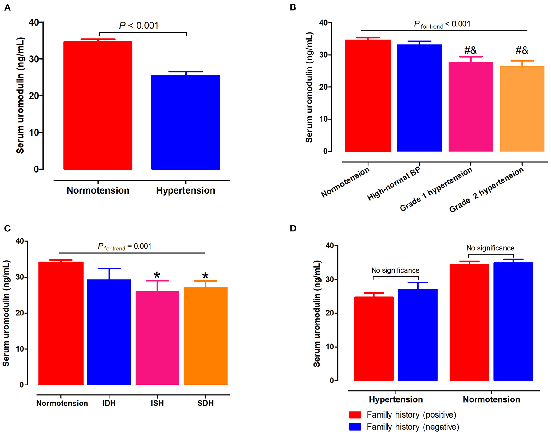 Results: SNPs rs12917707 and rs12708631 in the uromodulin gene were significantly associated with the longitudinal BP changes over 8 years of follow-up. SNP rs12708631 was significantly associated with the incidence of hypertension over 8 years. In addition, gene-based analyses supported the associations of uromodulin gene with the longitudinal BP changes and hypertension incidence in Baoji Salt-Sensitive Study cohort. Furthermore, serum uromodulin levels in the hypertensive subjects were lower than in the normotensive subjects (25.5 ± 1.1 vs. 34.7 ± 0.7 ng/mL). Serum uromodulin levels decreased gradually as BP levels increased (34.6, 33.2, 27.8, and 25.0 ng/mL for subjects with normotension, high-normal, grade 1 hypertension, and grade 2 hypertension, respectively). Serum uromodulin was significantly associated with the lower risk of hypertension [0.978 (0.972–0.984)] in Hanzhong Adolescent Hypertension Study cohort.