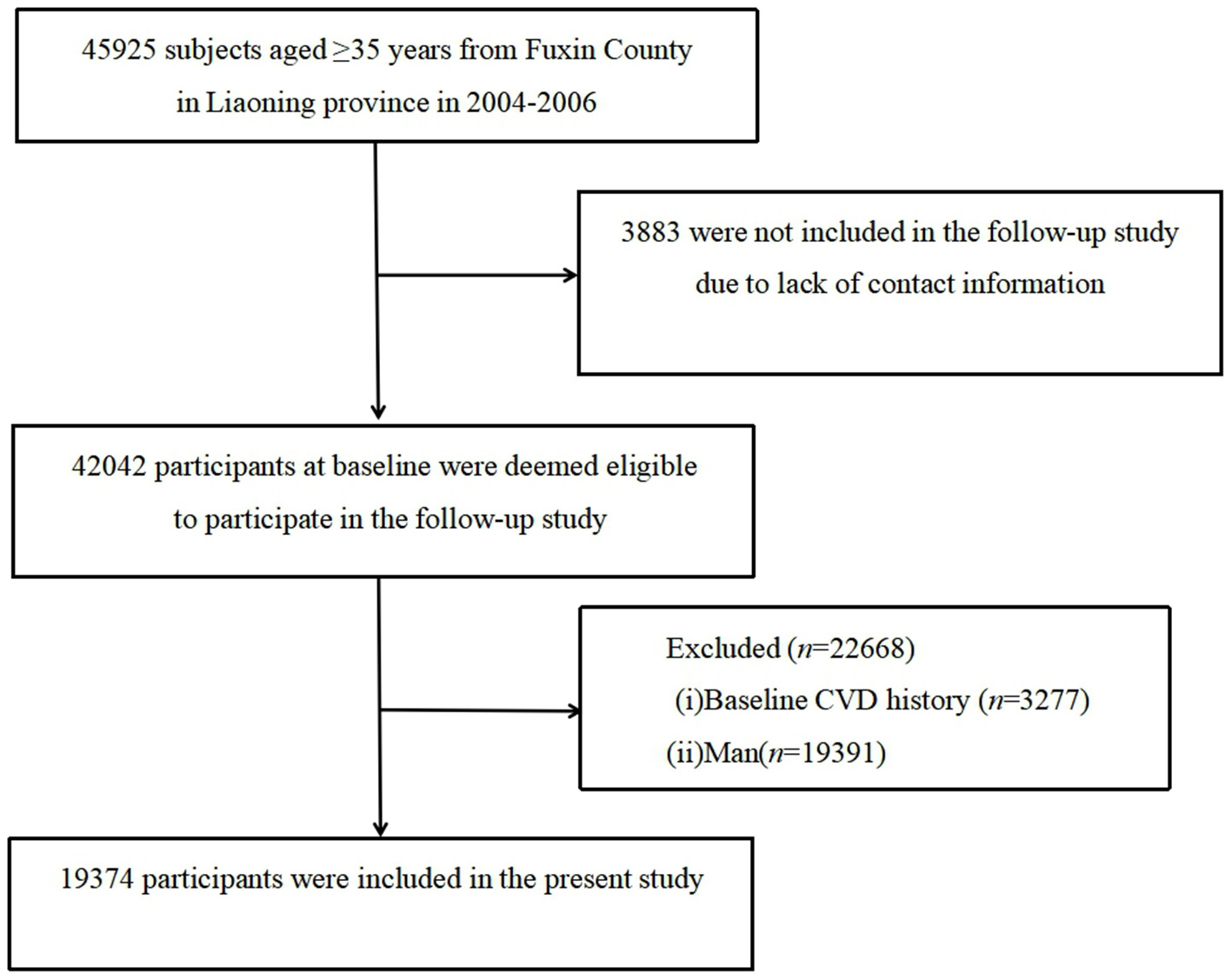 This was a large-scale epidemiological prospective cohort study. The study involved a randomly stratified, multistage, and cluster-sampling scheme comprising of participants aged ≥35 years recruited from 2004 to 2006. The primary objective of the study was to assess the incidence, prevalence, and risk factors for CVD. The first follow-up was conducted between January and July 2008, the second between July and December 2010, and the third between March and December 2017. Additional cases of adverse events such as mortality, stroke, and Myocardial Infarction (MI), were also recorded from the end of the baseline survey to the end of the third follow-up survey (January 2007–December 2017) (7, 8). Notably, 3,883 out of the 45,925 (8.5%) participants recruited at baseline were excluded from the study because they either lacked contact information or declined to appear during follow-ups, and out of the 42,042 (91.5%) participants were entitled to appeared at least once during the follow-up survey. Among them, a total of 22,668 participants with the following characteristics were excluded: (a) participants suffering from CVD (i.e., myocardial infarction (MI), stroke including arrhythmia, Coronary Heart Disease [CHD] and angina based on self-reports from participants) before baseline or at baseline survey (participant self-reporting) (n = 3,277), and (b) males (n = 19,391). Finally, 19,374 participants were eligible for further analysis (Figure 1).
