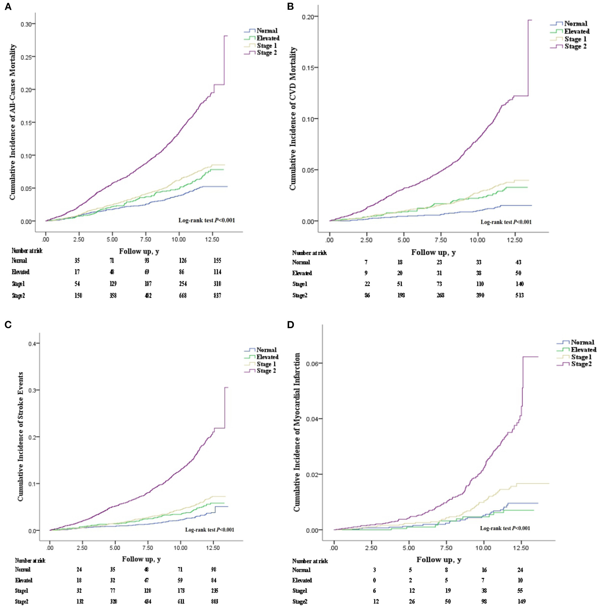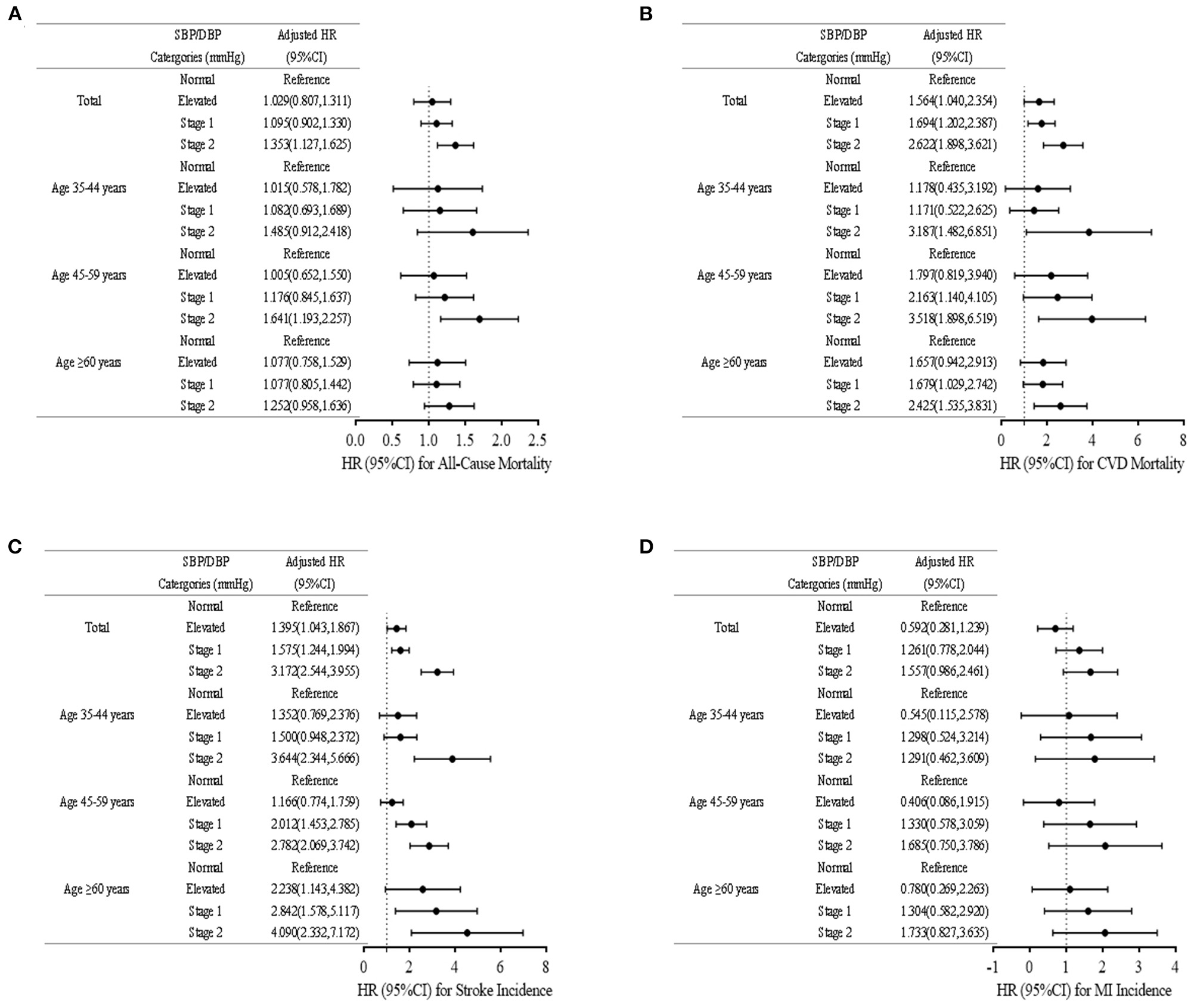 Cox regression analyses for association. Incident (A) All-Cause Mortality, (B) Cardiovascular Disease Mortality, (C) Stroke Incidence, and (D) Myocardial Infarction. Error bars represent 95% CI. Normal: SBP < 120 mm Hg and DBP < 80 mm Hg; Elevated: SBP of 120–129 mm Hg and DBP of <80 mmHg; Stage 1: SBP of 130–139 mmHg or DBP 80–89 mmHg; Stage 2: SBP/DBP ≥ 140/90 mm Hg, or taking antihypertensive medications. SBP, systolic blood pressure; DBP, diastolic blood pressure. CI, confidence interval. Adjusted for age, current smoking, current drinking, ethnicity, education level, physical activities, BMI, history of diabetes, family history of hypertension, history of hyperlipidemia.