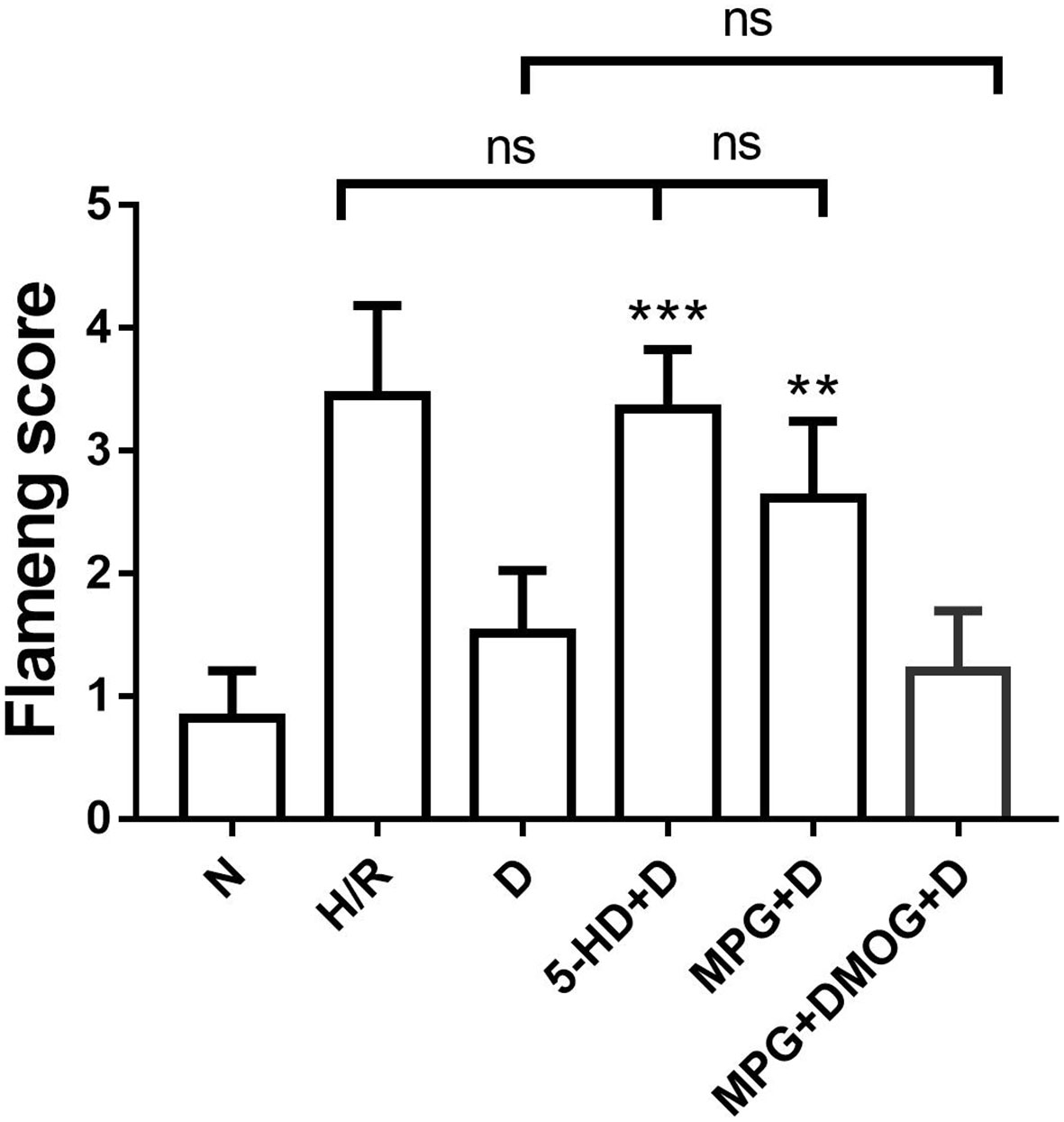 There were appreciable differences in the Flameng score between the N group and the H/R group. However, the Flameng score of the D group was significantly decreased compared with that of the H/R group (P < 0.001). Nonetheless, the Flameng score was increased in the 5-HD+D group (P < 0.001) and the MPG+D group (P = 0.003) compared with the D group. In addition, the Flameng score of the MPG+DMOG+D group was similar to that of the D group (P > 0.999) (Figure 3).
