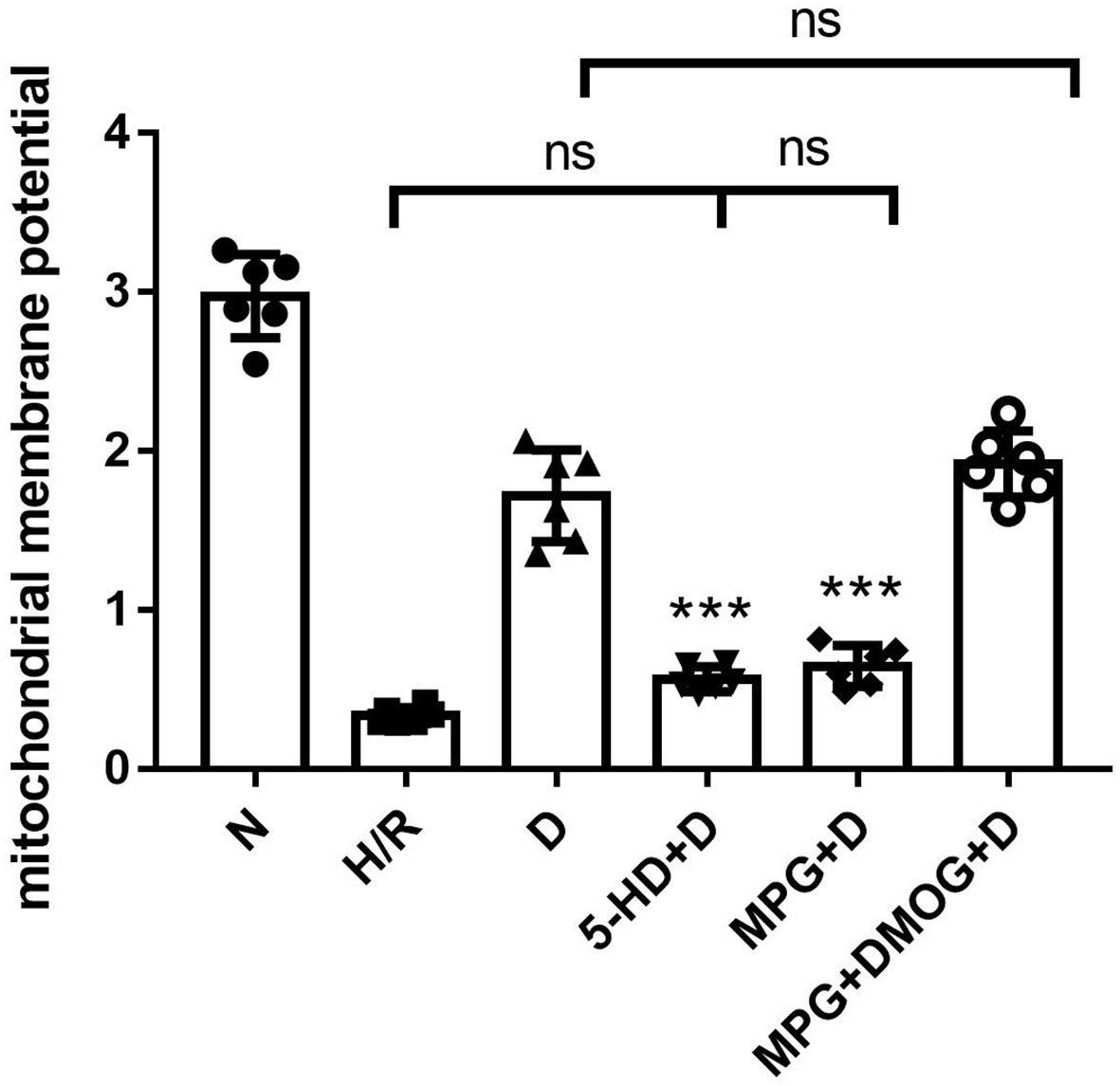 Mitochondrial membrane potential. ***P < 0.001 vs. D group. n = 6/group. Each value is the result of 6 experiments performed with different isolated preparations of cardiomyocytes. One-way ANOVA followed by Tukey's multiple comparisons tests was used for analyze.
