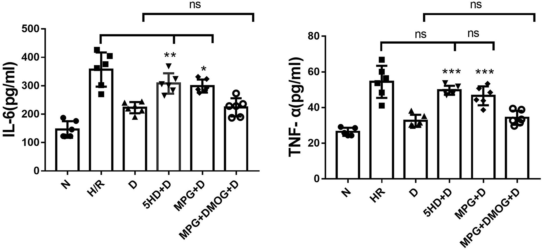 IL-6 and TNF-α were markedly decreased in the D group compared with the H/R group (P < 0.001). However, the protective effects of diazoxide on IL-6 and TNF-α were eliminated by administration of 5-HD and MPG, while in the 5-HD+D (P < 0.001) and MPG+D groups (P = 0.010), IL-6 and TNF-α were increased. Administration of DMOG in the MPG+DMOG+D group reduced IL-6 and TNF-α levels compared with the MPG+D group (P = 0.012) (Figure 5).