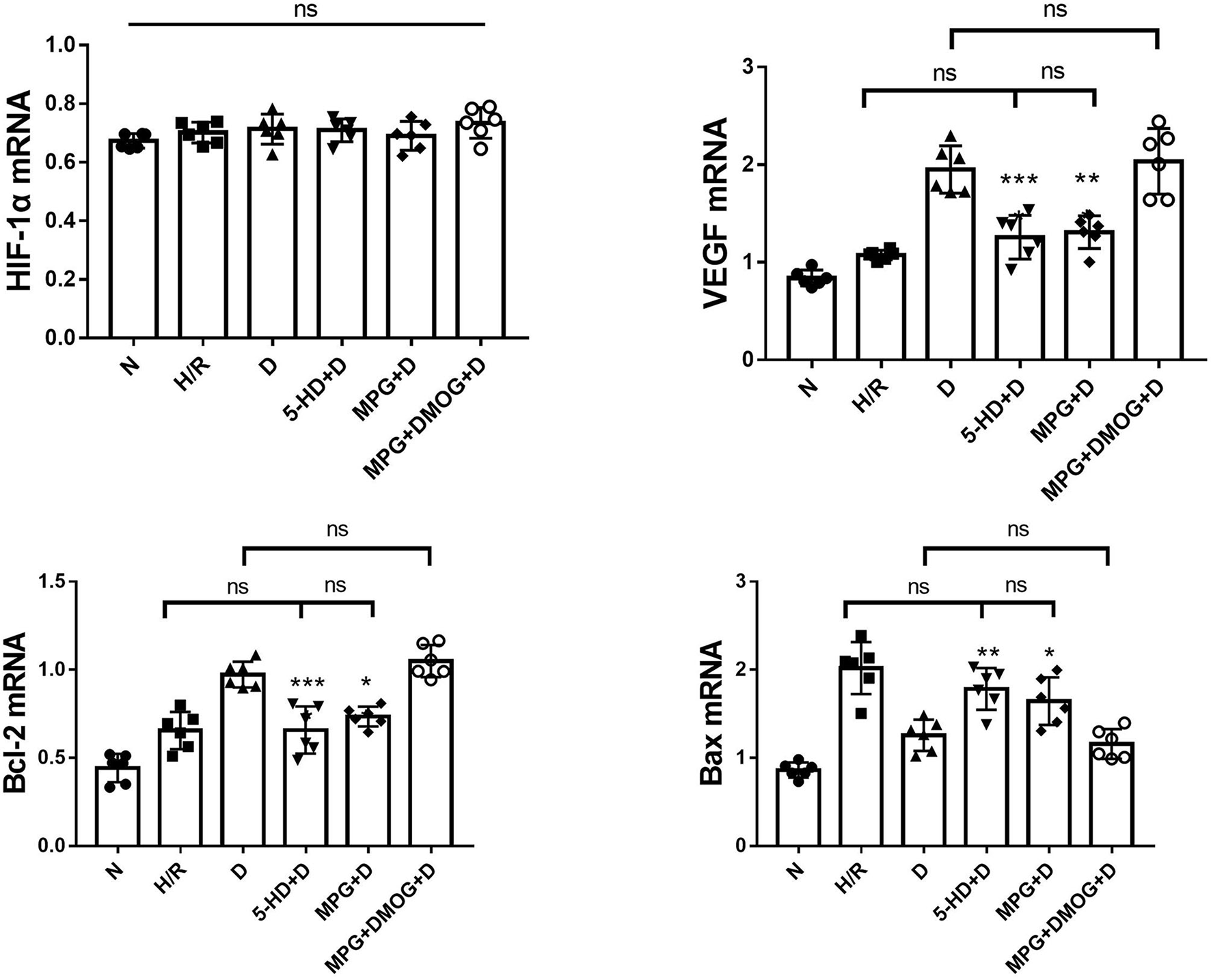 mRNA expression of HIF-1α, VEGF, Bcl-2, and Bax. *P < 0.05 vs. D group; **P < 0.01 vs. D group; ***P < 0.001 vs. D group. n = 6/group. Each value is the result of 6 experiments performed with different isolated preparations of cardiomyocytes. One-way ANOVA followed by Tukey's multiple comparisons tests was used for analyze.