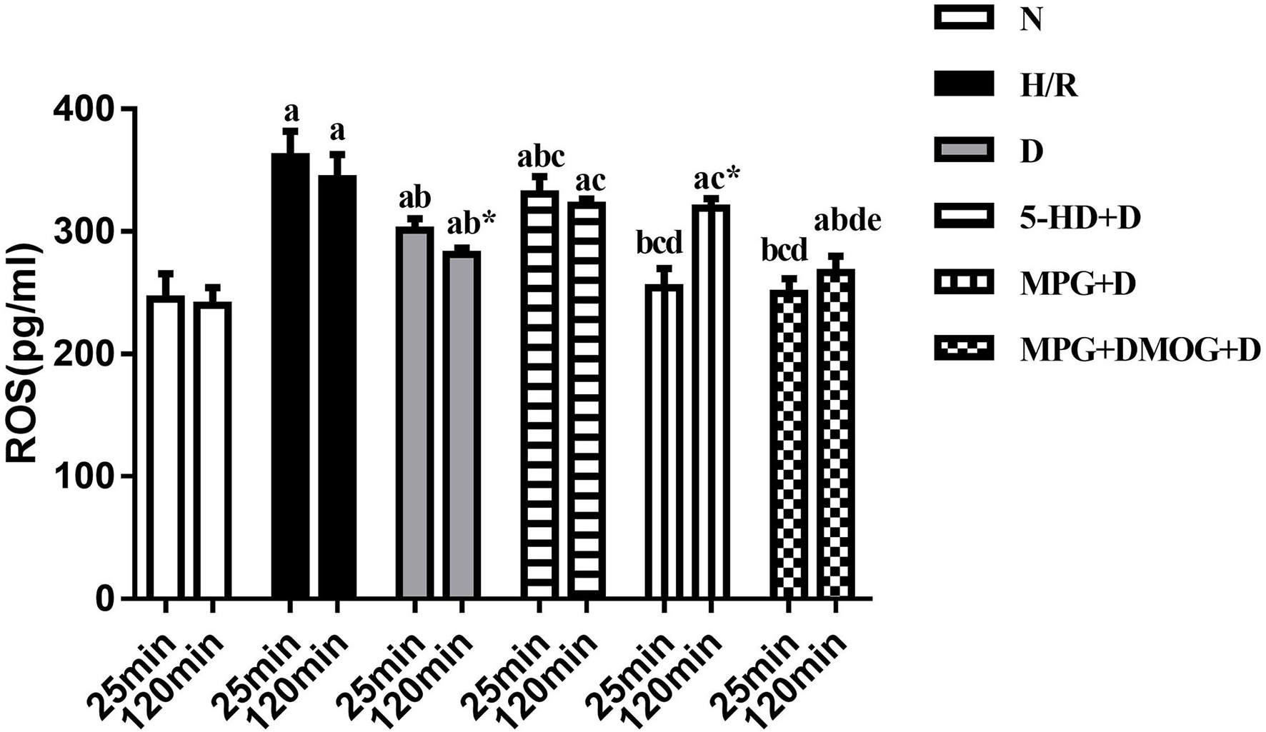 ROS content. aP < 0.05 vs. N group; bP < 0.05 vs. H/R group; cP < 0.05 vs. D group; dP < 0.05 vs. 5-HD+D group. eP < 0.05 vs. MPG+D group. *P < 0.05 vs. 25 min. n = 6/group. Each value is the result of 6 experiments performed with different isolated preparations of cardiomyocytes. Two-way ANOVA followed by Sidak's multiple comparisons test was used to compare ROS concentration between multiple groups at the different time point.