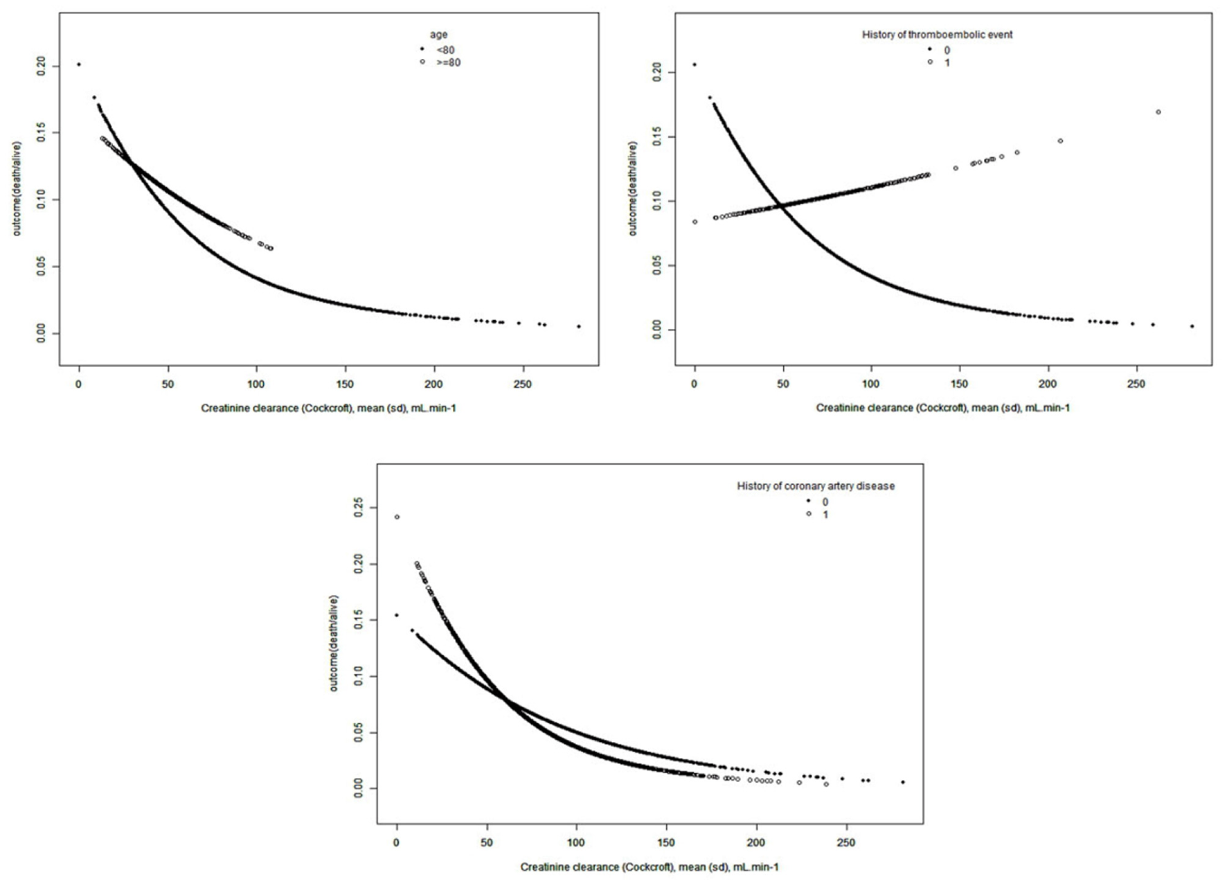 The results of subgroup analysis showed that the associations between Cockcroft-Creatinine clearance and MDRD-Creatinine clearance and the outcome were robust among all subgroups (except a history of a thromboembolic event, Chronic kidney disease requiring dialysis). The directions and values of odds ratio among different subgroups changed not significantly and with very small magnitude (<5%), and the 95% confidence interval are also stable (Supplementary Table 1).
