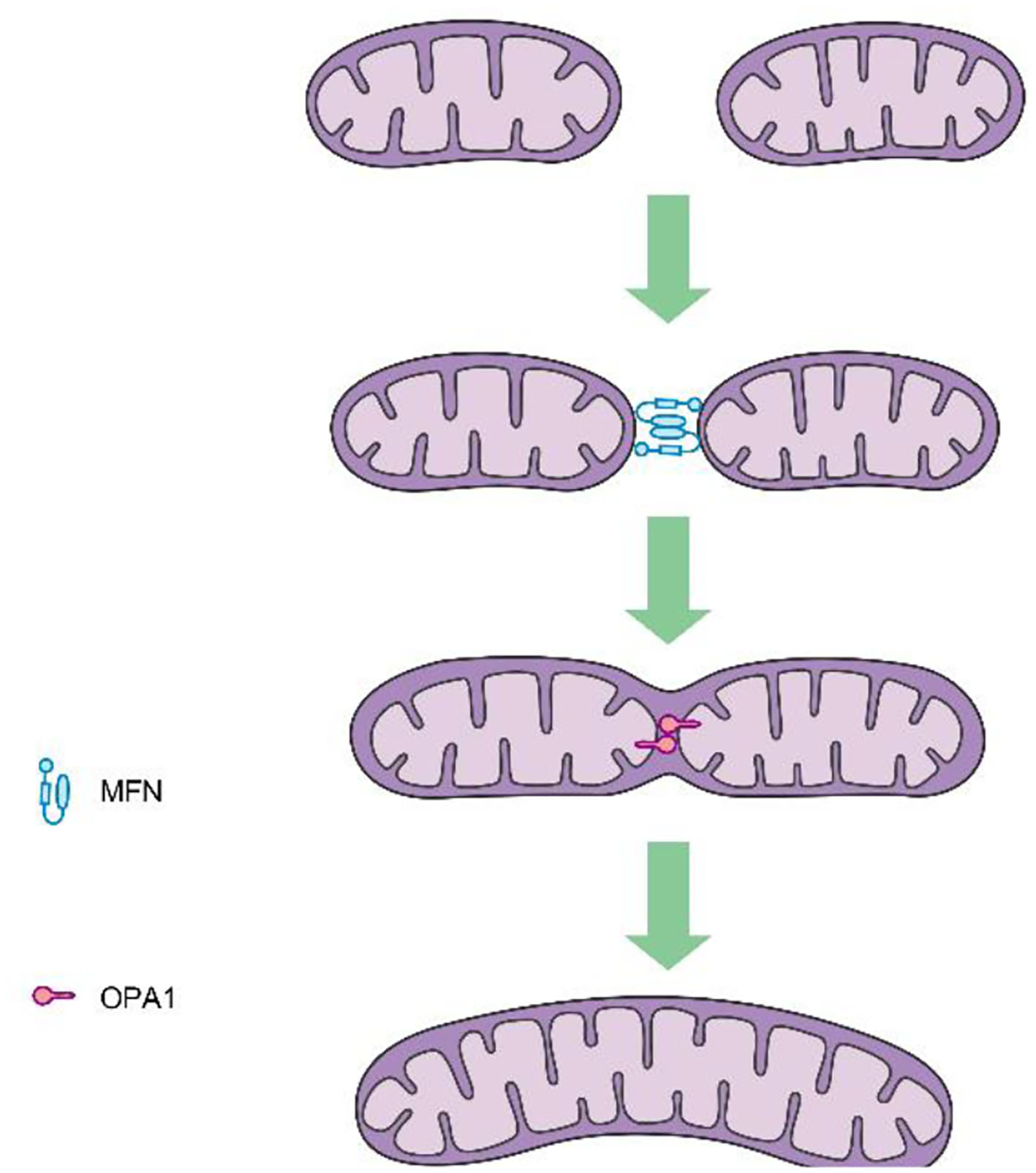 Mitochondrial fission is mediated by dynamin-related protein 1 (DRP1), a GTPase-dependent enzyme that is recruited to the outer mitochondrial membrane through a series of receptor proteins (MFF, FIS1, MID49, and MID50) (5). Together, DRP1 and FIS1 mediate fission and participate in apoptosis activation, necrosis, and autophagy (6), after which DRP1 divides the mitochondria into two in a GTP-dependent manner (See in Figure 1). In mammals, mitochondrial fusion is generally regulated by three GTPase-dependent proteins in the dynamin superfamily, namely, mitofusin-1 (MFN1), mitofusin-2 (MFN2), and optic atrophy 1 (OPA1), all of which participate in the processes of energy metabolism, mitochondrial permeability transition, and calcium homeostasis (6, 7). Generally, mitochondrial fusion requires three steps. First, MFN1 or MFN2 reversibly approach the outer mitochondrial membranes. Second, the outer membranes of the two mitochondria fuse via MFN1 and MFN2 under GTPase mediation. Third, the inner mitochondrial membranes fuse via OPA1 in a GTPase-dependent manner (Figure 2).