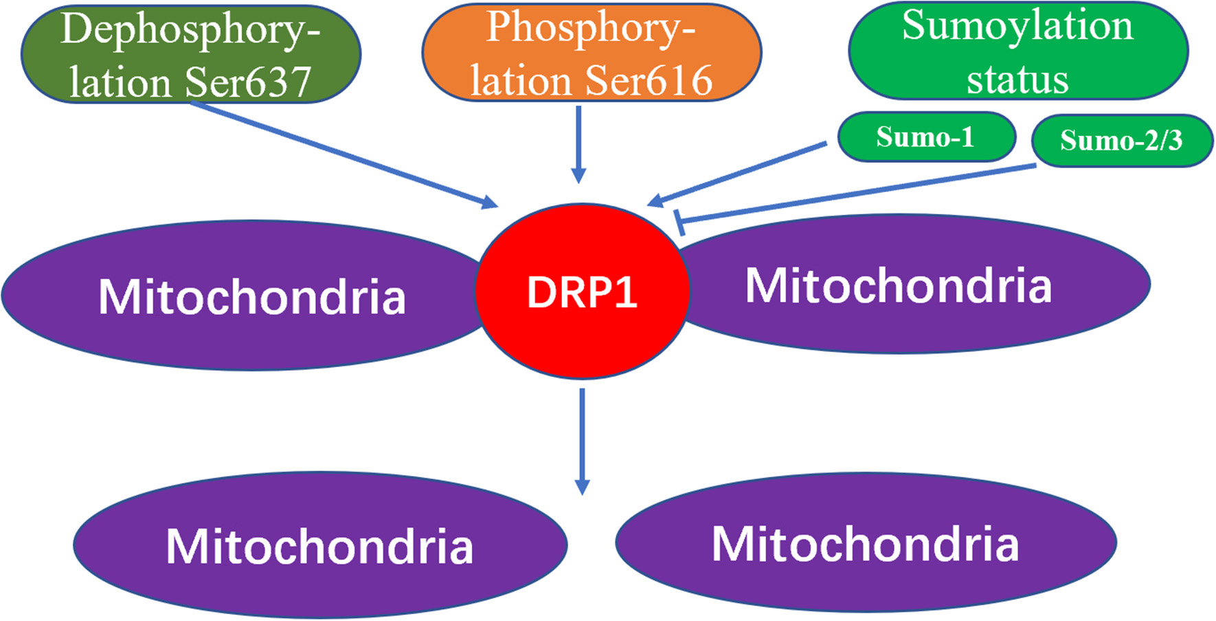 The mechanism of mitochondrial fission caused by Drp1 modification. The increased dephosphorylation of Ser637 on the drp1 protein or the increased phosphorylation of Ser616, and the change of the sumoylation state of DRP1 will effect the activity of DRP1, thereby increasing the fission of mitochondria.